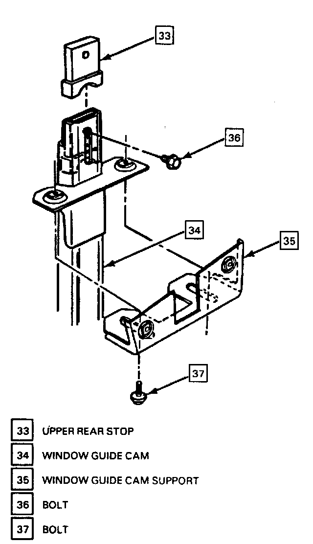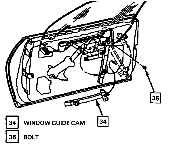 3. Bolts (36) retaining the window guide cam (34) to the door inner panel.