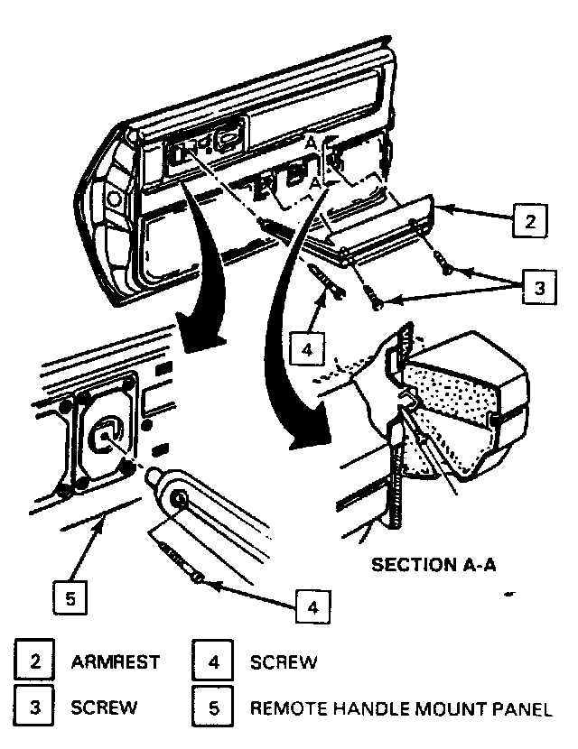1. Screws (3 and 4) retaining armrest (2) to the door trim panel, the armrest hanger plate, and the trim pad switch and remote handle mount panel (5).