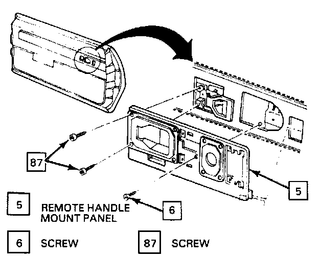 3. Screws (6 and 87) retaining trim pad switch and remote handle mount panel (5) to door trim panel.