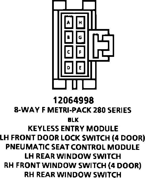 Keyless Entry Module, Front Door Lock Switch (4 Door), Pneumatic Seat Control Module, Rear Window Switch, RH Front Window Switch (4 Door) Connector Faces: