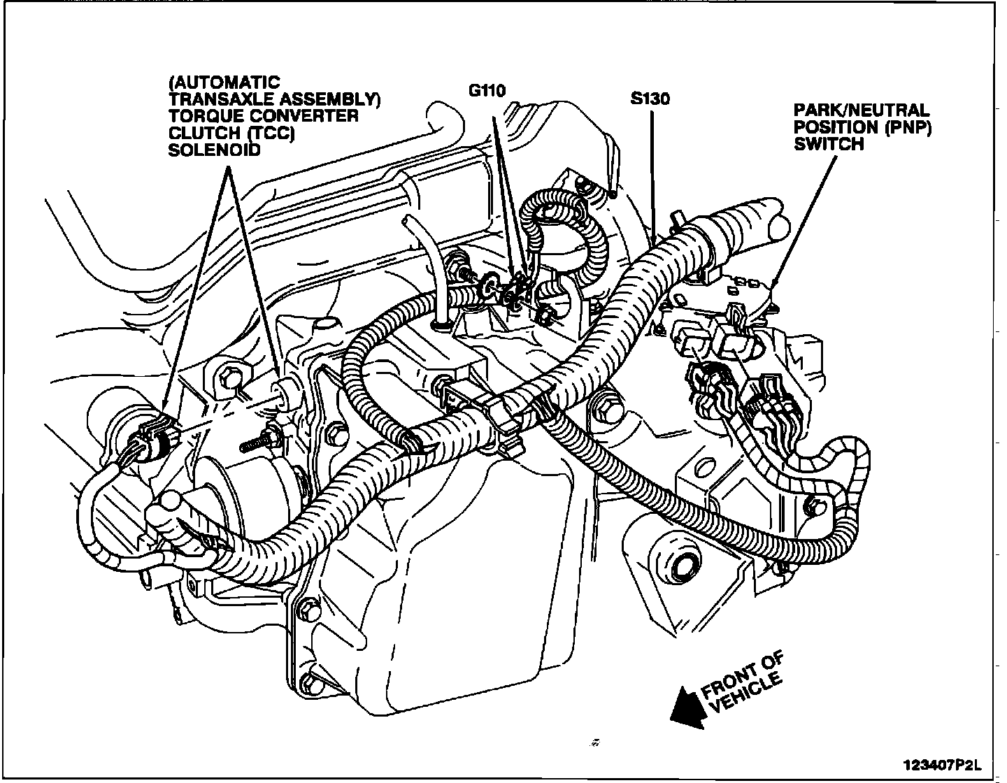 LH rear of engine compartment, top of transaxle