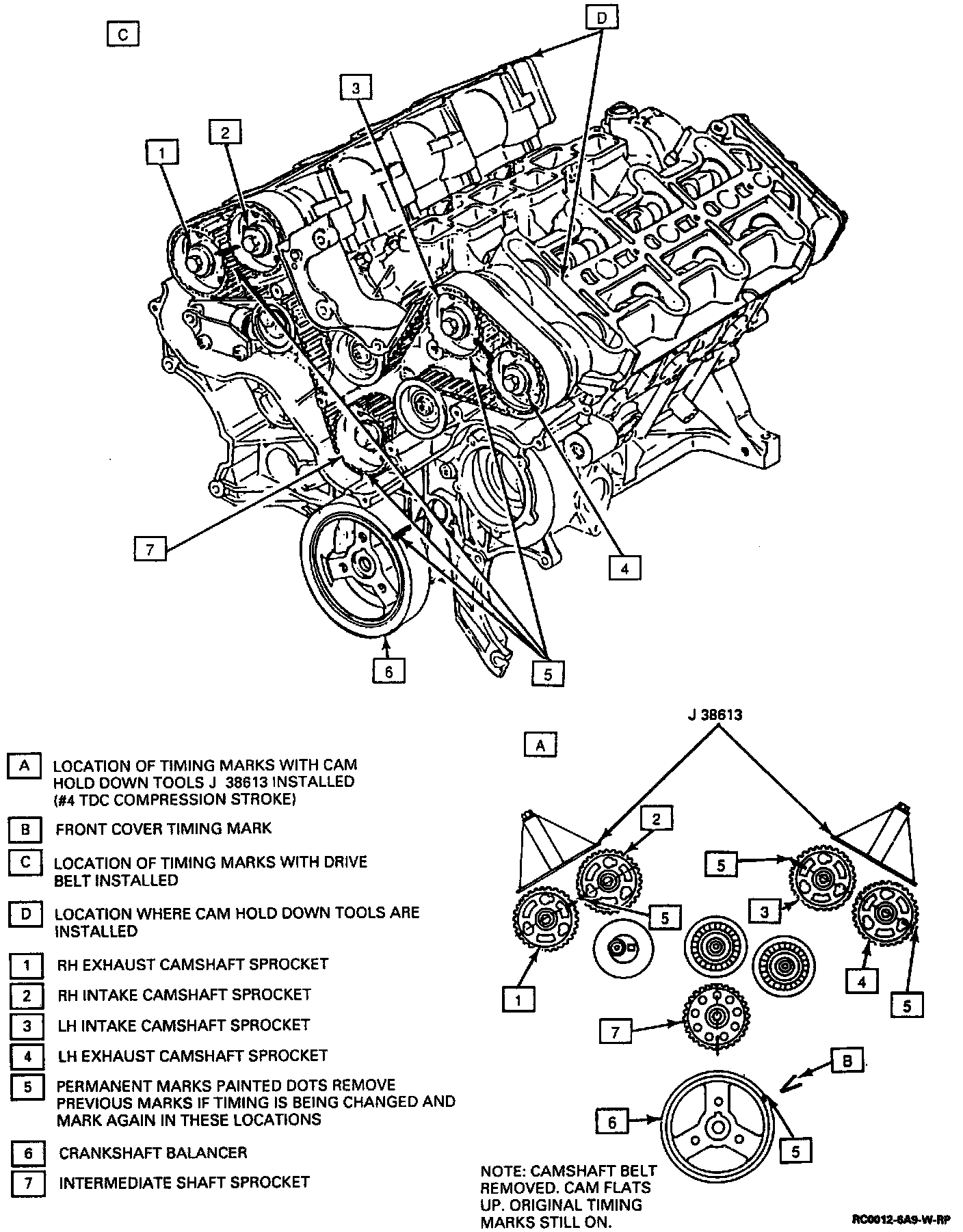 NOTE: GM does not provide a timing mark diagram for belt installation without using the special tool(s) listed below.For proper cam timing the use of tool J-38613-A is needed.