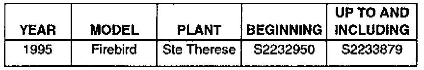 Involved are certain 1995 Pontiac Firebird model vehicles built within the VIN breakpoints as shown.