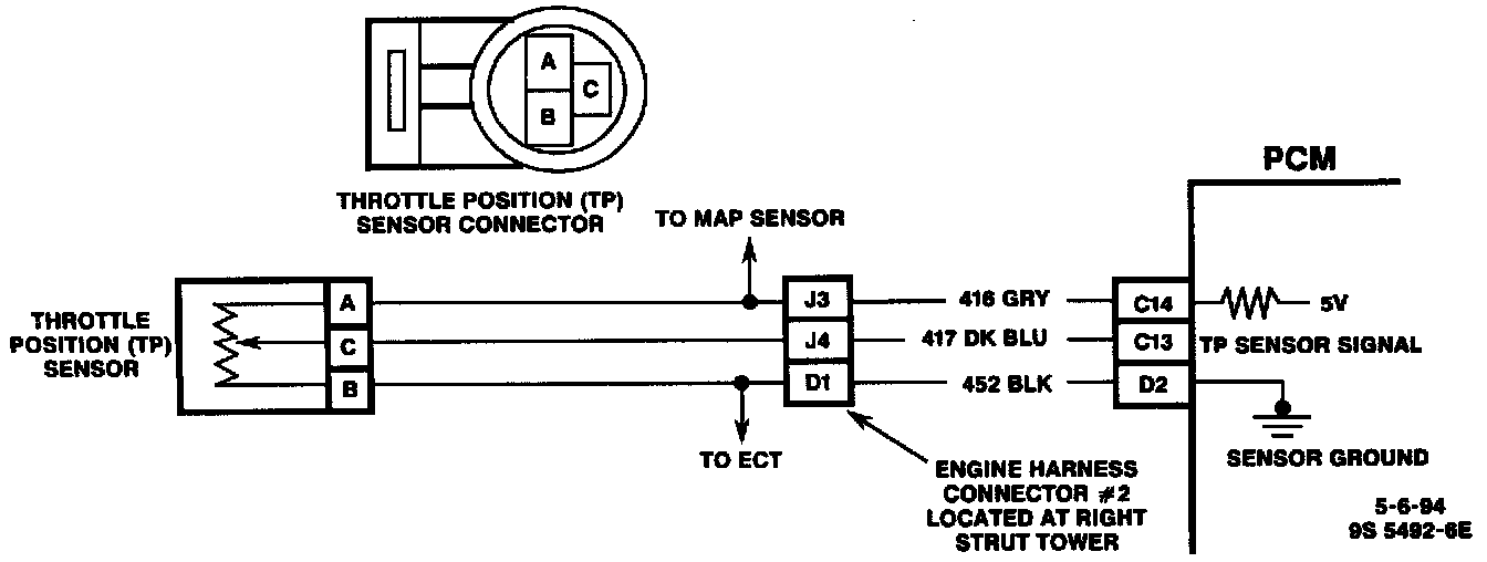 The Throttle Position (TP) sensor is connected to the throttle shaft on the TBI unit. It is a potentiometer with one end connected to 5 volts from the Powertrain Control Module (PCM) and the other to ground. A third wire is connected to the PCM to measure the voltage from the TP sensor. As the throttle valve angle is changed (accelerator pedal moved), the output of the TP sensor also changes. At a closed throttle position, the output of the TP sensor is low (approximately 0.5 volt). As the throttle valve opens, the output increases so that, at wide-open throttle, the output voltage should be approximately 5 volts.