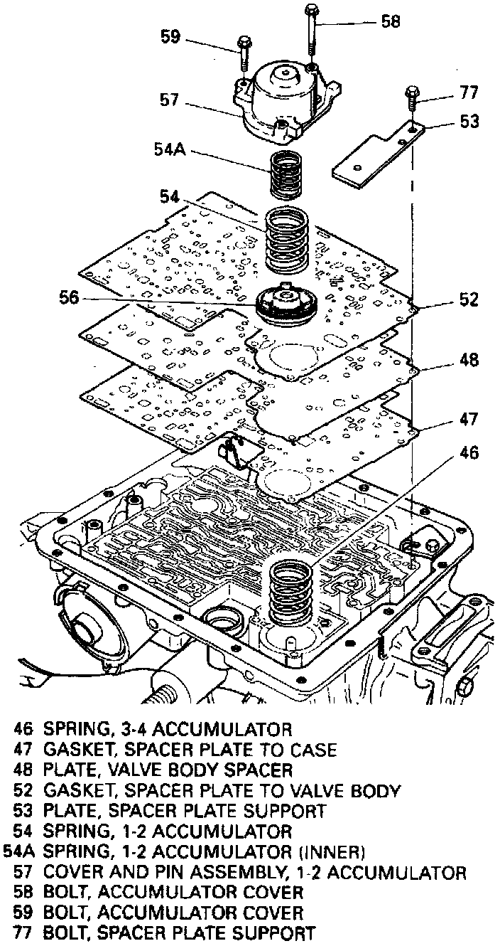 22. Install 1-2 accumulator cover and pin assembly onto case.