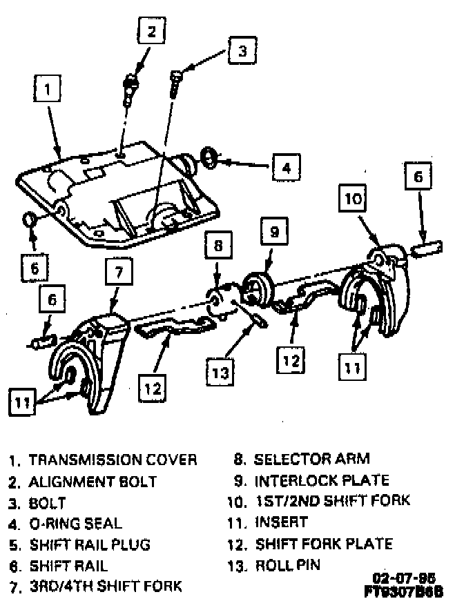 2. Shift rail, shift forks, shift fork plates, selector arm, interlock plate and roll pin.