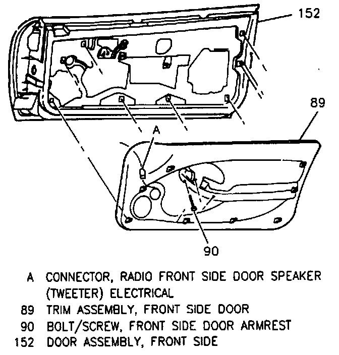 ^ Pull trim assembly (89) away from door assembly(152), making sure that hooks release from holes in door inner panel.
