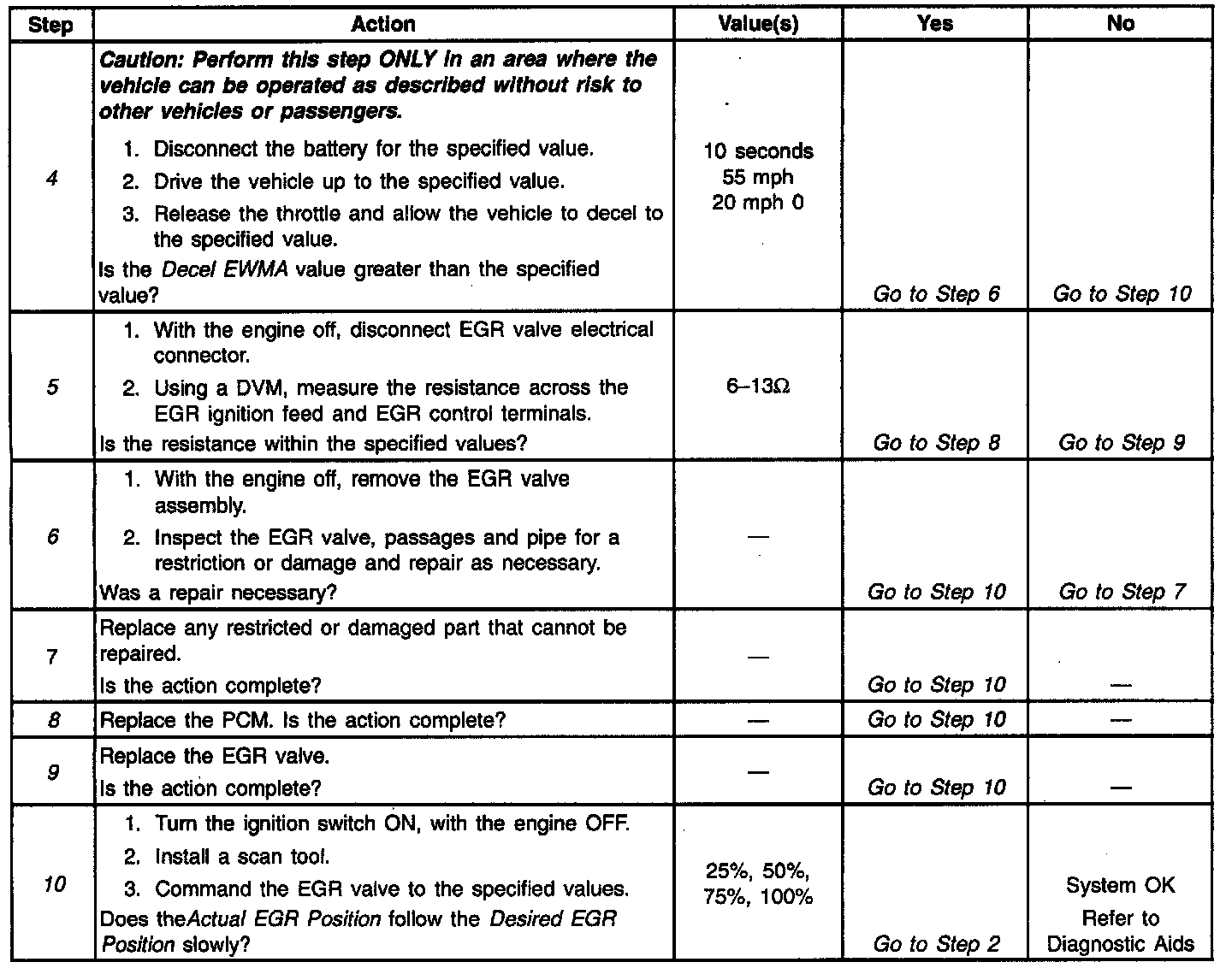 ^ A more negative number (less than -3) indicates that the system is working normally whereas a positive number indicates that the system is being restricted and that the expected amount of EGR flow is incorrect. A number that falls between negative 3 and positive 2 indicates that the system is partially restricted but not restricted enough to tail. The Decel EWMA value should always be a -3 or lower. It the Decel EWMA number becomes more positive (towards 0 or more), then the EGR system is becoming restricted. Look for possible damage to the EGR pipe or for a restriction caused by carbon deposits in the EGR passages or on the EGR valve.