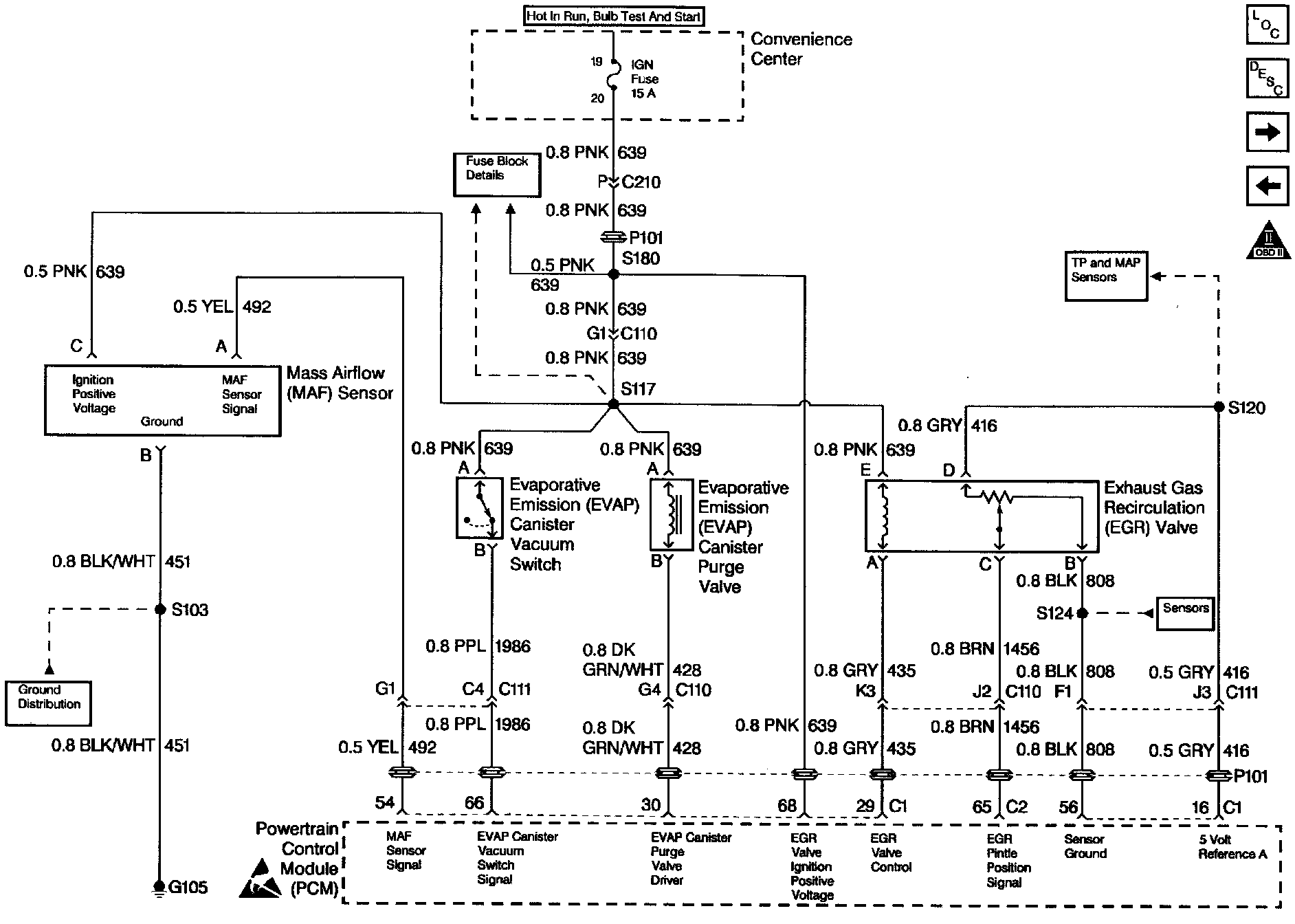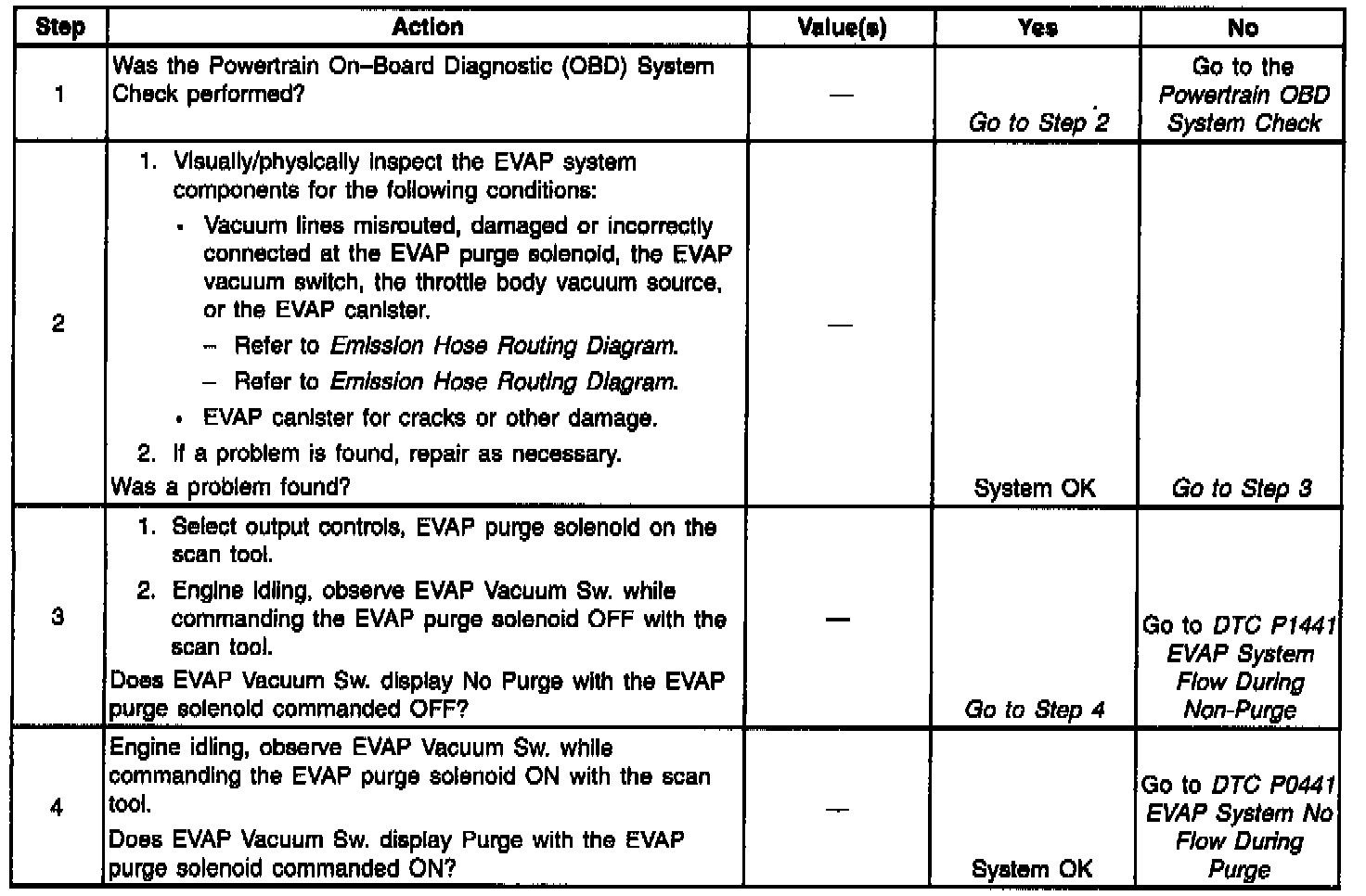 The EVAP purge vacuum switch is a normally closed switch positioned in the purge line between the canister and the EVAP purge solenoid. The EVAP purge vacuum switch will open when vacuum increases to greater than 5 inches of water in the purge line. The PCM monitors the EVAP purge vacuum switch signal to determine of the evaporative emission control system is working properly. If the switch is closed (no purge flow) when the PCM is commanding the EVAP purge solenoid ON, DTC P0441 should be set. If the switch is open (purge flow detected) when the PCM is not commanding the EVAP purge solenoid ON, DTC P1441 should be set. If the switch is open when sufficient vacuum should not be present, DTC P1442 should be set.