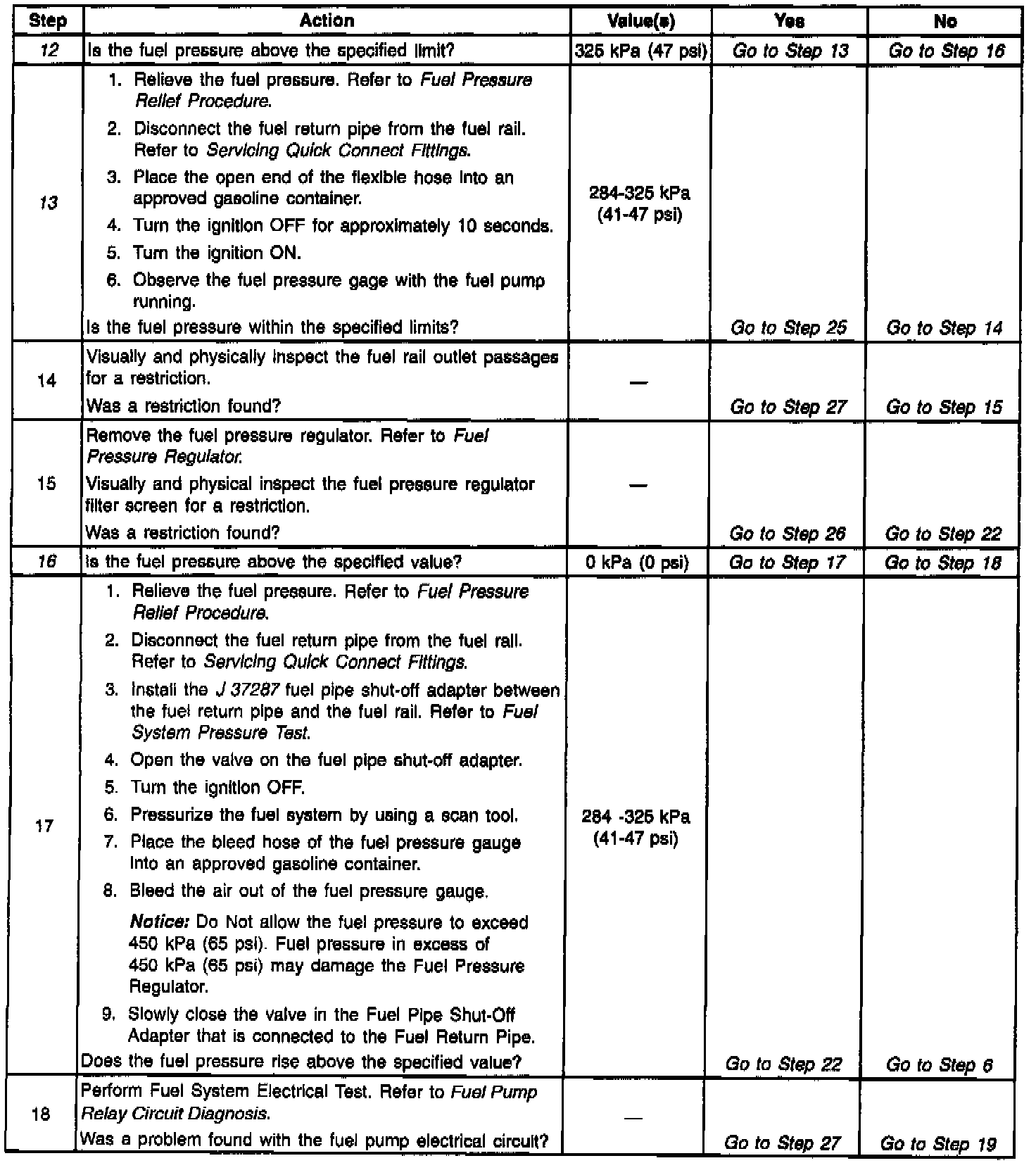 13. This test determines if the high fuel pressure is due to a restricted fuel return pipe or if the high fuel pressure is due to a faulty fuel pressure regulator.