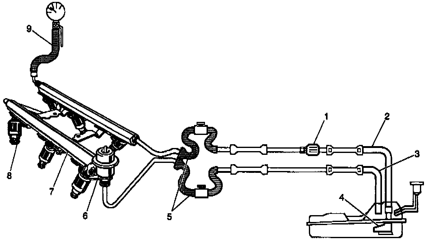 When the ignition switch is turned ON, the Powertrain Control Module (PCM) will turn ON the in-tank fuel pump. The in-tank fuel pump will remain ON as long as the engine is cranking or running and the PCM is receiving reference pulses. If there are no reference pulses, the PCM will turn the in-tank fuel pump OFF 2 seconds after the ignition switch is turned ON or 2 seconds after the engine stops running. The in-tank fuel pump is an electric pump, attached to the Fuel Sender Assembly. The in-tank fuel pump (4) supplies fuel through the fuel feed pipe (2), and in-line fuel filter (1) to the Fuel Rail Assembly (7). The fuel pump is designed to provide fuel at a pressure above the pressure needed by the fuel injectors (8). A fuel pressure regulator (6), attached to the Fuel Rail, keeps the fuel available to the fuel injectors at a regulated pressure. Unused fuel is returned to the fuel tank by a separate fuel return pipe (3). The fuel pressure gauge J 34730-1A (9) and fuel pipe shut off adapters J 37287 (5) are used for fuel system diagnosis.