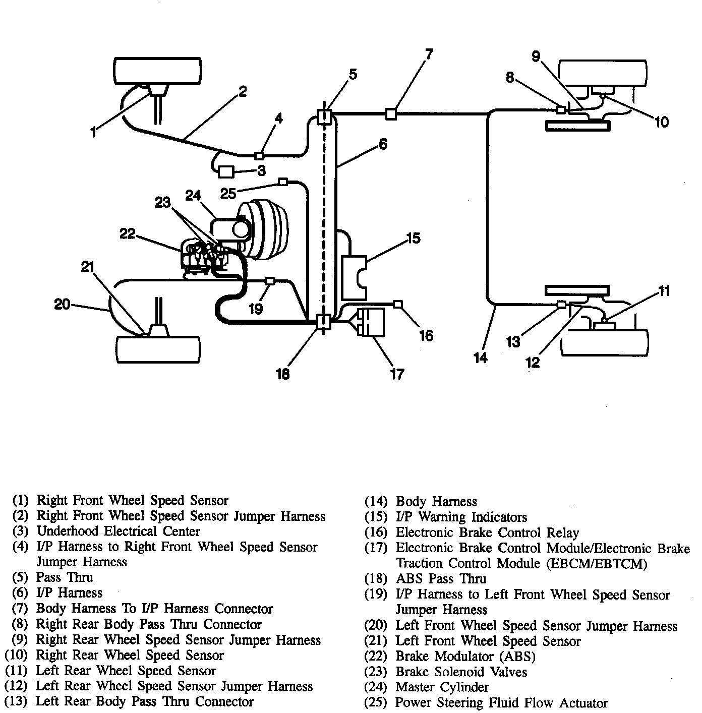 The controlling element of Antilock Brake System (ABS) VI is a microprocessor based Electronic Brake Control Module/Electronic Brake Traction Control Module (EBCM/EBTCM). Inputs to the system include four wheel speed sensors, the brake switch, ignition switch, and unswitched battery voltage. Outputs include three bidirectional motor controls, four indicator controls, two solenoid controls, and the system enable relay. A serial data line, located in terminal 9 of the Data Link Connector (DLC), is provided for service diagnostic tools and assembly plant testing.
