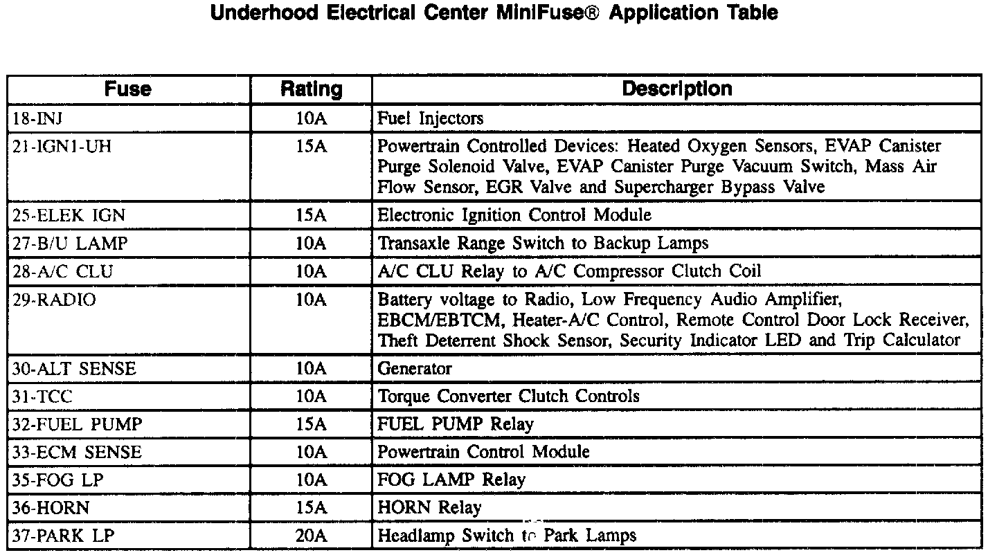 Underhood Electrical Center Mini Fuse Application Table: