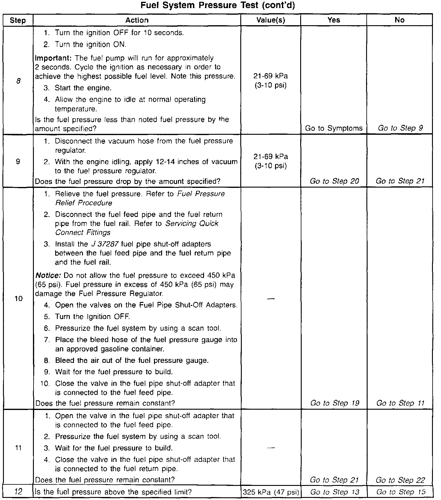 16. Restricting the fuel return pipe with the Fuel Pipe Shut-Off Adapter J 37287 causes the fuel pressure to rise above the regulated fuel pressure. Using a scan tool to pressurize the system, the fuel pressure should rise above 325 kPa (47 psi) as the valve on the Fuel Pipe Shut-Off Adapter connected to the fuel return pipe becomes partially closed.