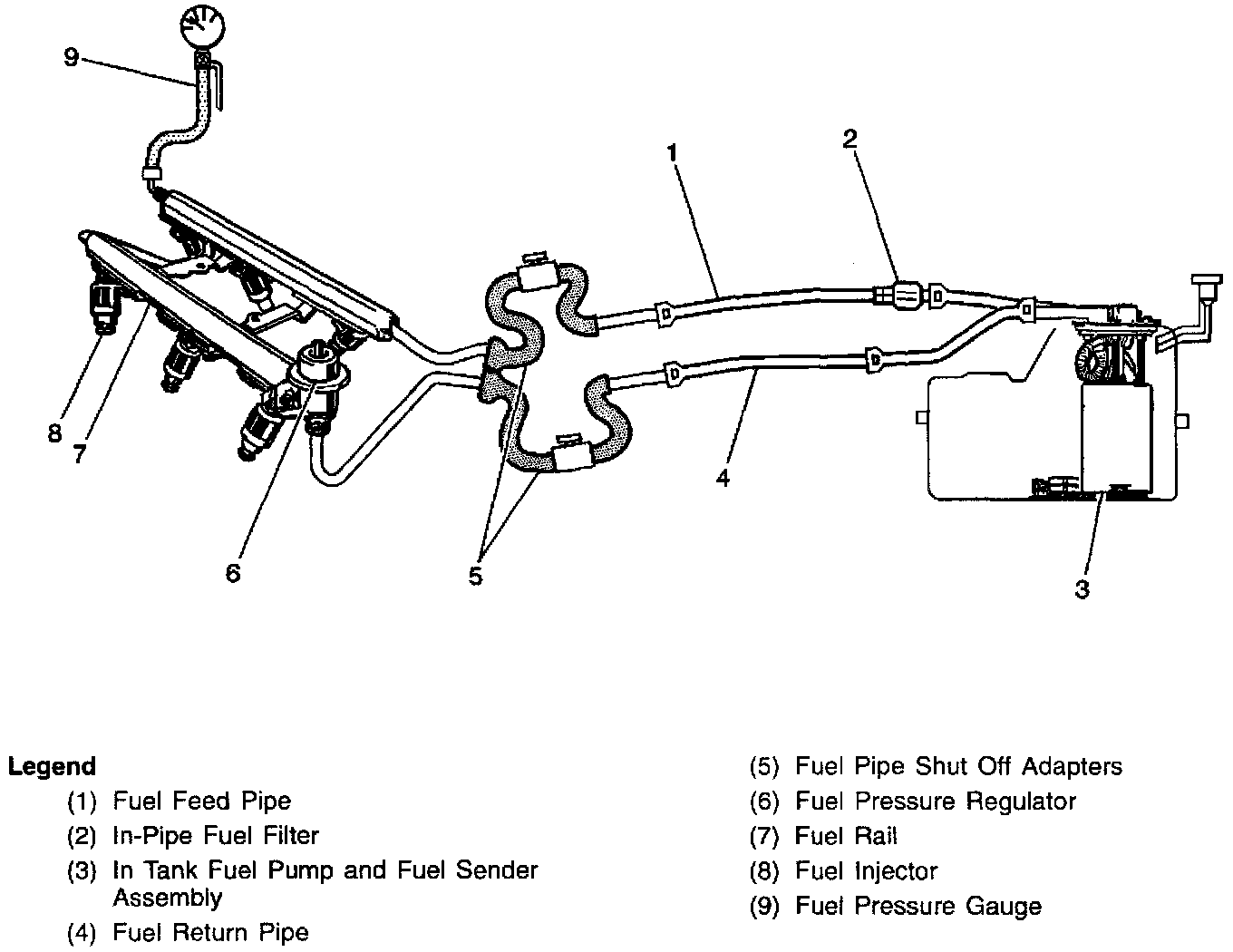 When the ignition switch is turned ON, the Powertrain Control Module (PCM) will turn ON the in-tank fuel pump. The in-tank fuel pump will remain ON as long as the engine is cranking or running and the PCM is receiving reference pulses. If there are no reference pulses, the PCM will turn the in-tank fuel pump OFF 2 seconds after the ignition switch is turned ON or 2 seconds after the engine stops running. The in-tank fuel pump is an electric pump, attached to the Fuel Sender Assembly. The in-tank fuel pump supplies fuel through the fuel feed pipe, and in-line fuel filter to the Fuel rail Assembly. The fuel pump is designed to provide fuel at a pressure above the pressure needed by the fuel injectors. A fuel pressure regulator, attached to the Fuel rail, keeps the fuel available to the fuel injectors at a regulated pressure. Unused fuel is returned to the fuel tank by a separate fuel return pipe. The fuel pressure gauge J 34730-1A and fuel pipe shut off adapters J 37287 are used for fuel system diagnosis.