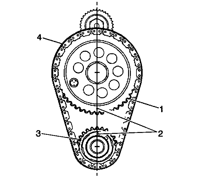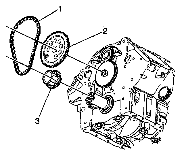 1. Install the timing chain (1) onto the sprockets (2, 3) with the timing marks in their closest together position.