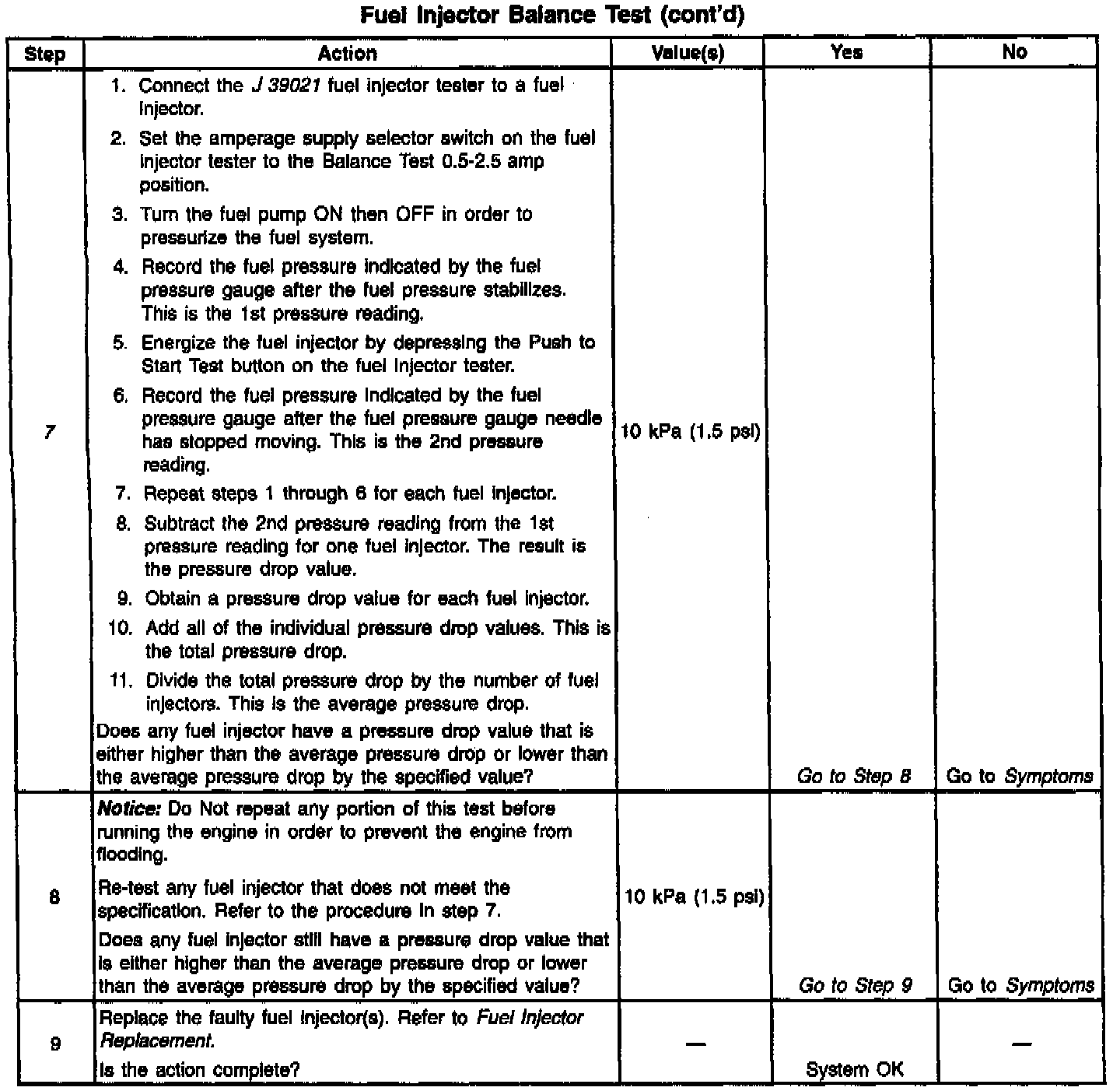 7. If the pressure drop value for each fuel injector is within 10 kPa (1.5 psi) of the average pressure drop value, the fuel injectors are flowing properly. Calculate the pressure drop value for each fuel injector by subtracting the second pressure reading from the first pressure reading. Refer to the Injector Balance Test Example.