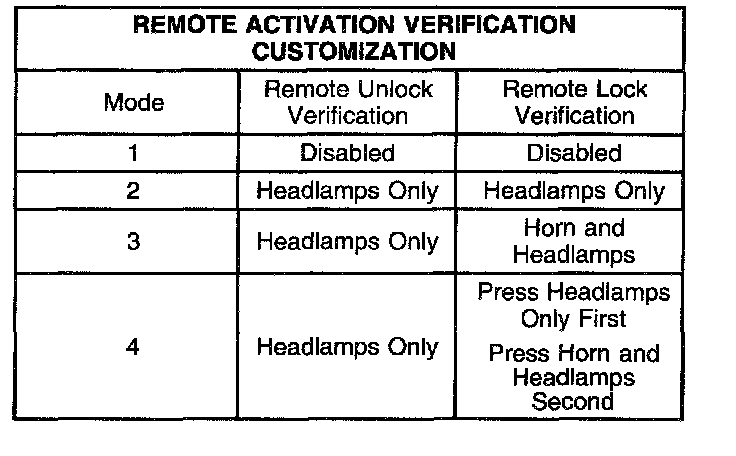 2. Turn the ignition to the ACC position. The seat belt telltale flashes and the chime bongs 1-4 times, equal to the current customization mode. This indicates which mode the vehicle is in. Each time the transmitter LOCK button is pressed, the mode number advances. A transition past mode 4 will repeat, starting again at mode 1.