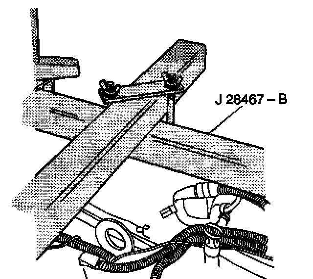 15. Install the assembled lift hook bracket (J 28467-6A) over the radiator shelf tube (J 28467-2A).