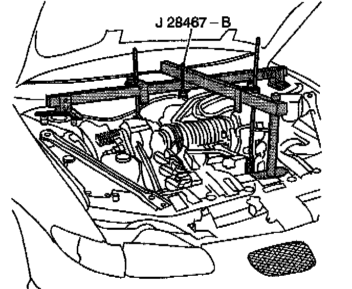 16. Adjust the radiator shelf tube (J 28467-2A) and the assembled lift hook bracket (J 28467-6A) in order to align the hook with the left (front), rear of engine, lift hook bracket attached to the left (front) exhaust manifold.