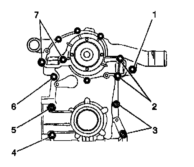 11. Install the engine front cover bolts (1 - 7).