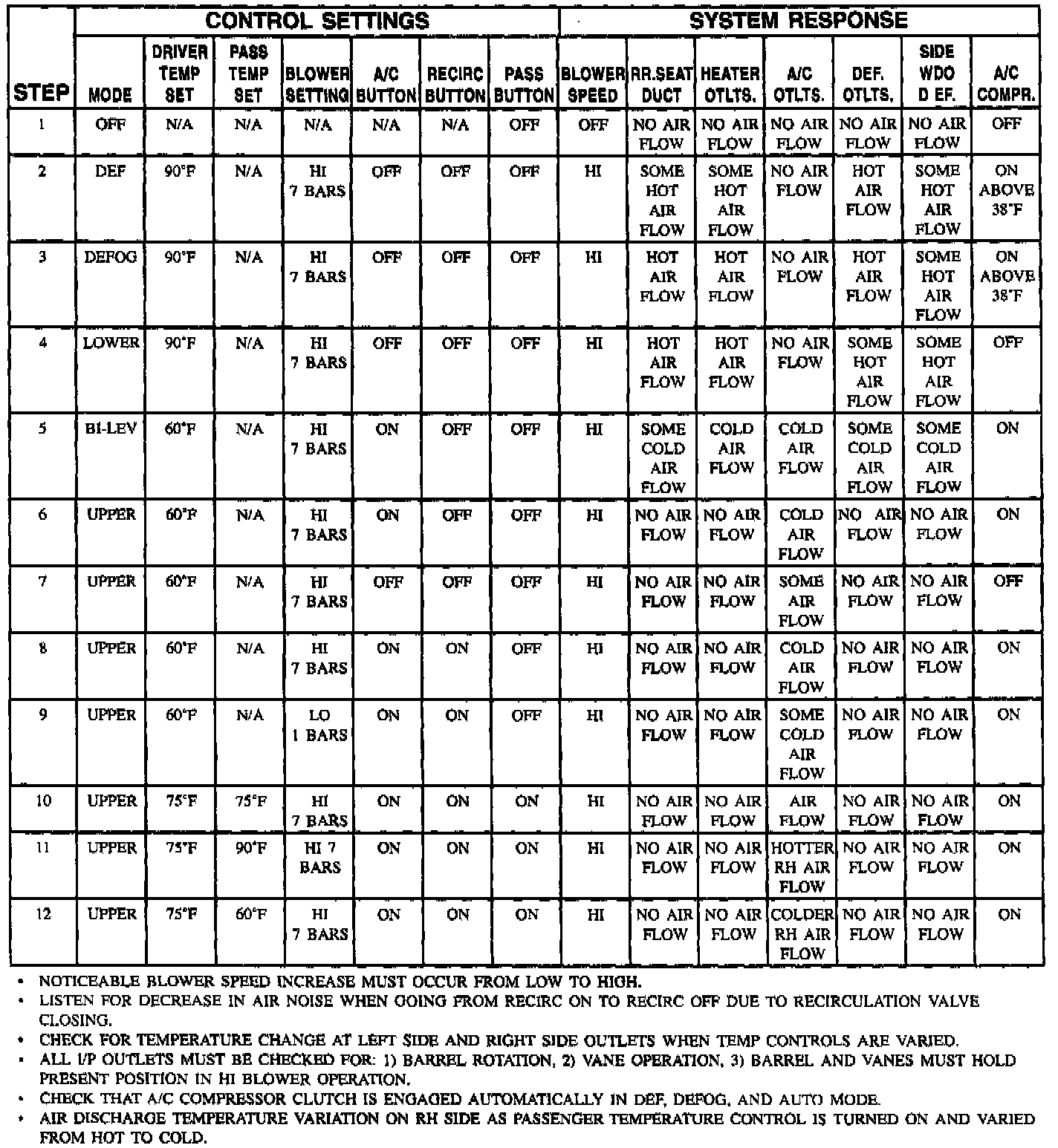 The following is a list of quick checks used to determine if the system is functioning properly. Before Initiating the quick check procedures, cycle the ignition switch ON, then OFF; and then ON again. The heater A/C temperature and mode LED's should light and repeat at the same positions as the ignition is cycled. With the ignition on, without interruption for a minimum of three minutes to allow for the blower delay to time out, test the HEAT functions. A check of the following mode sequences indicates if any mode selections are not functioning properly. The compressor will not operate at ambient temperatures below 3°C (38°F).