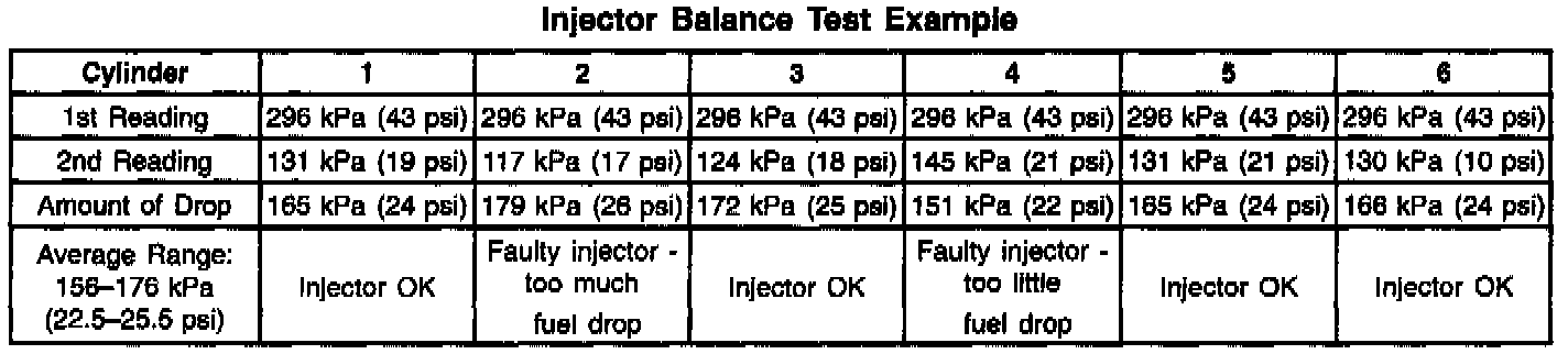 7. If the pressure drop value for each fuel injector is within 10 kPa (1.5 psi) of the average pressure drop value, the fuel injectors are flowing properly. Calculate the pressure drop value for each fuel injector by subtracting the second pressure reading from the first pressure reading. Refer to the Injector Balance Test Example.