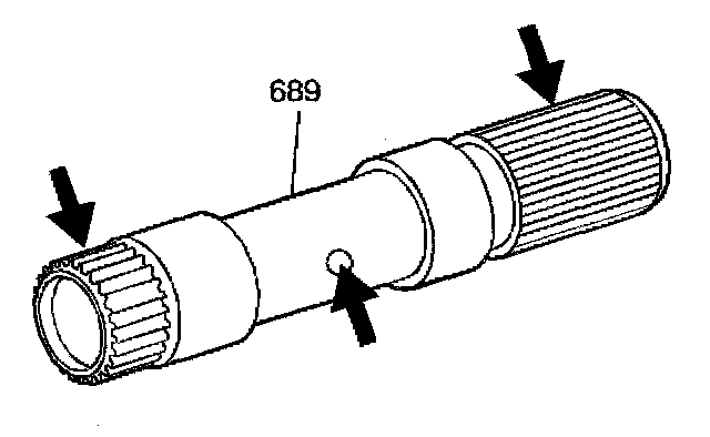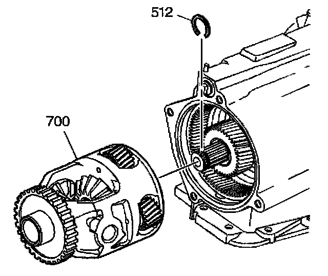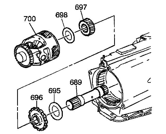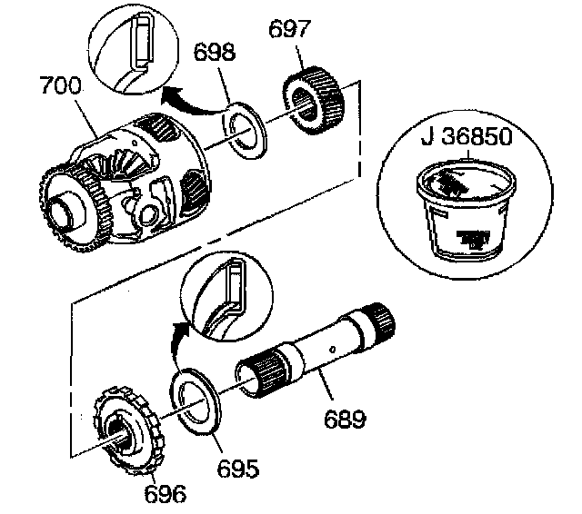 1. Assemble the sun gear thrust bearing (698), the differential carrier sun gear (697), the park gear (696), the internal gear thrust bearing (695) and the sun gear shaft (689) into the differential carrier (700).