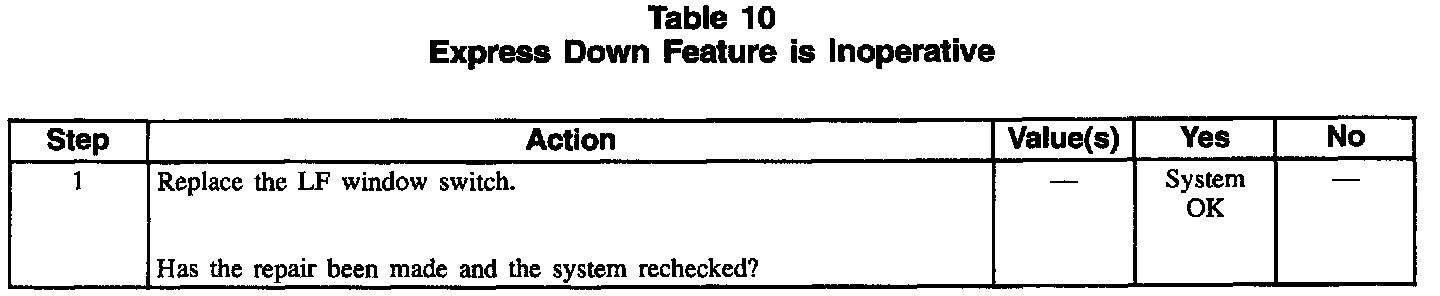 Table 10 Express Down Feature Is Inoperative: