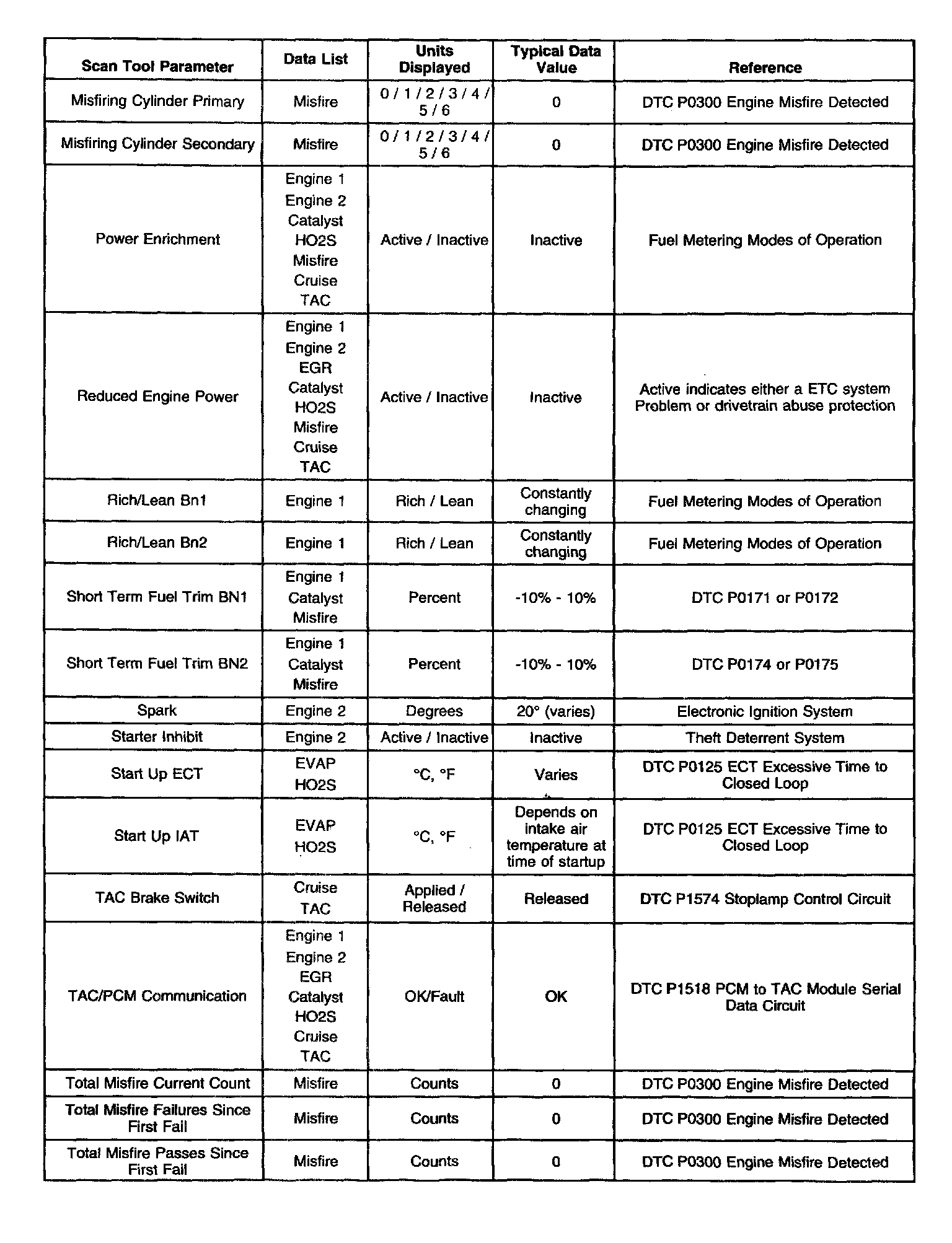 Use the Typical Scan Data Values table only after the Powertrain On-Board Diagnostic System Check has been completed, no DTCs were noted and you have determined the on-board diagnostics are functioning properly. Scan tool values from a properly running engine may be used for comparison with the engine you are diagnosing. The Typical Scan Data values represent values that would be seen on a normally running engine.