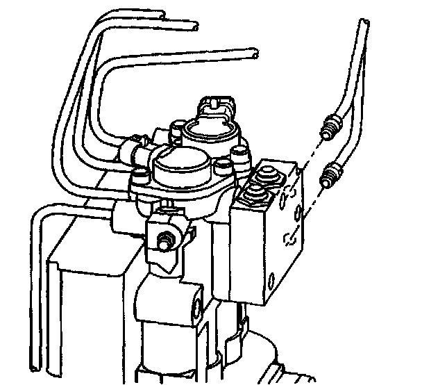 Important: Once the fluid is visibly flowing from both modulator bleeder valves, the ABS brake modulator assembly is sufficiently full of fluid. The assembly may not be completely purged of air. At this point, move to the wheel brakes and bleed the brakes. This ensures that the lowest points in the system are completely free of air.