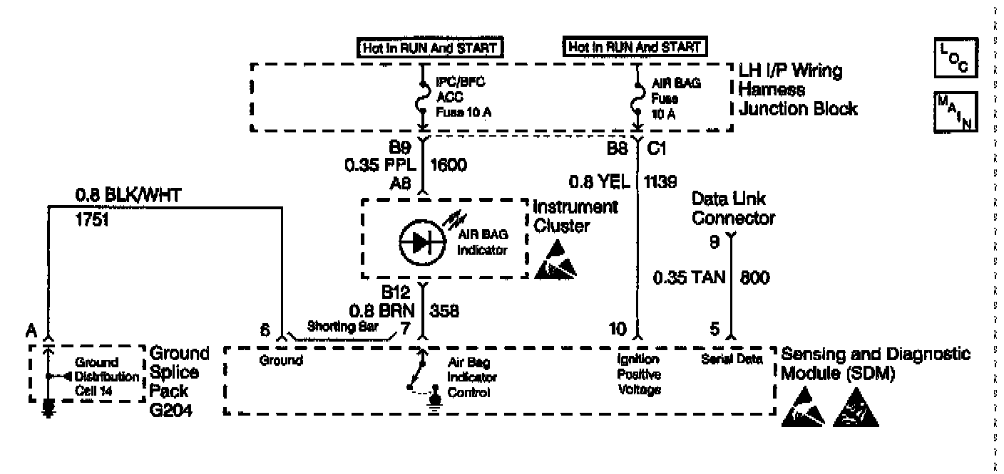 The data link connector (DLC) is the provision for communicating with the Inflatable Restraint Sensing and Diagnostic Module (SDM). The DLC is located under the instrument panel. The DLC supplies Battery voltage and ground to the scan tool. The scan tool communicates with the SDM on the serial data line through circuit 800. The scan tool is connected to the DLC in order to perform the following functions:
