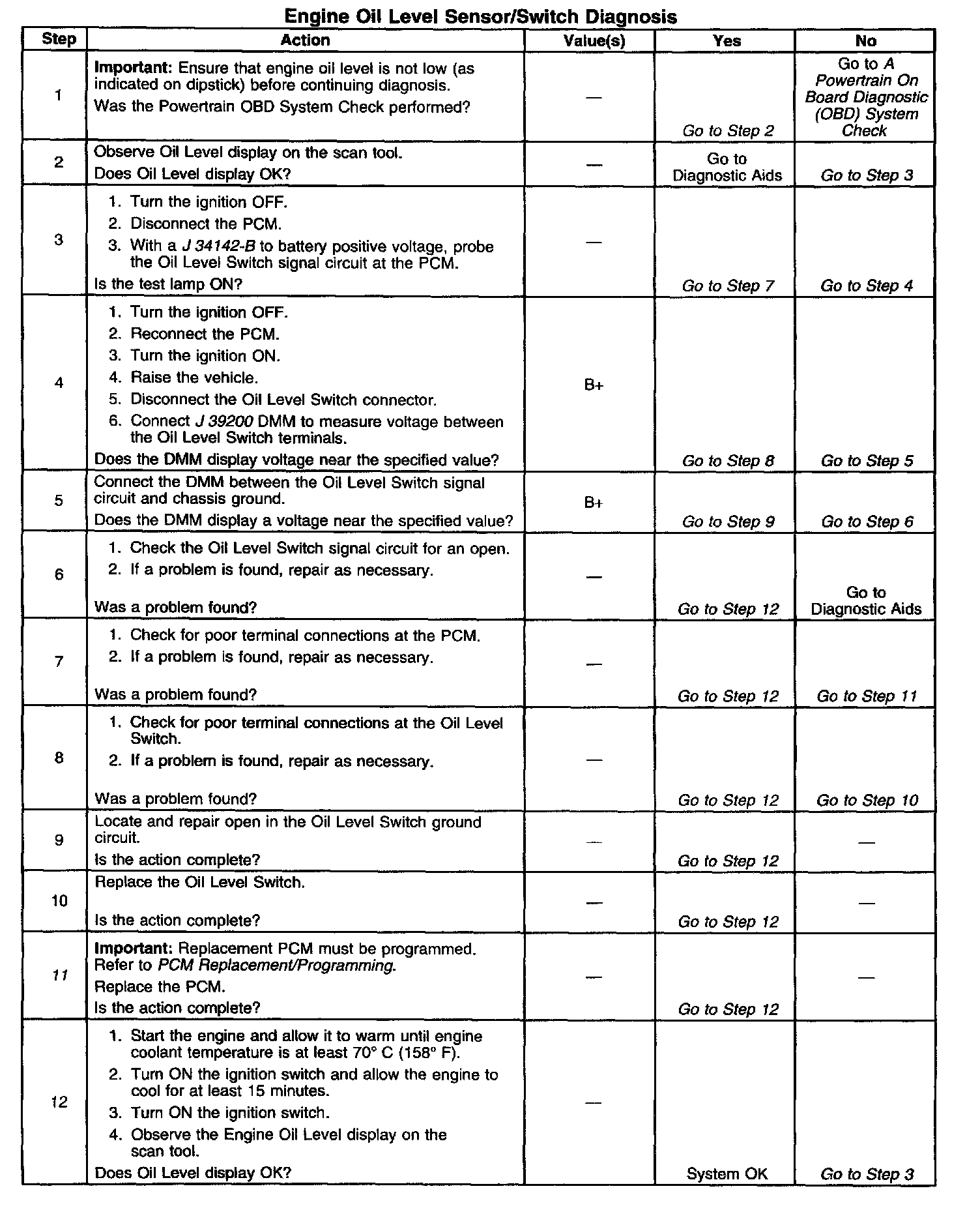 ^ Poor connection at PCM or oil level sensor. Inspect harness connectors for backed out terminals, improper mating, broken locks, improperly formed or damaged terminals, and poor terminal to wire connection.