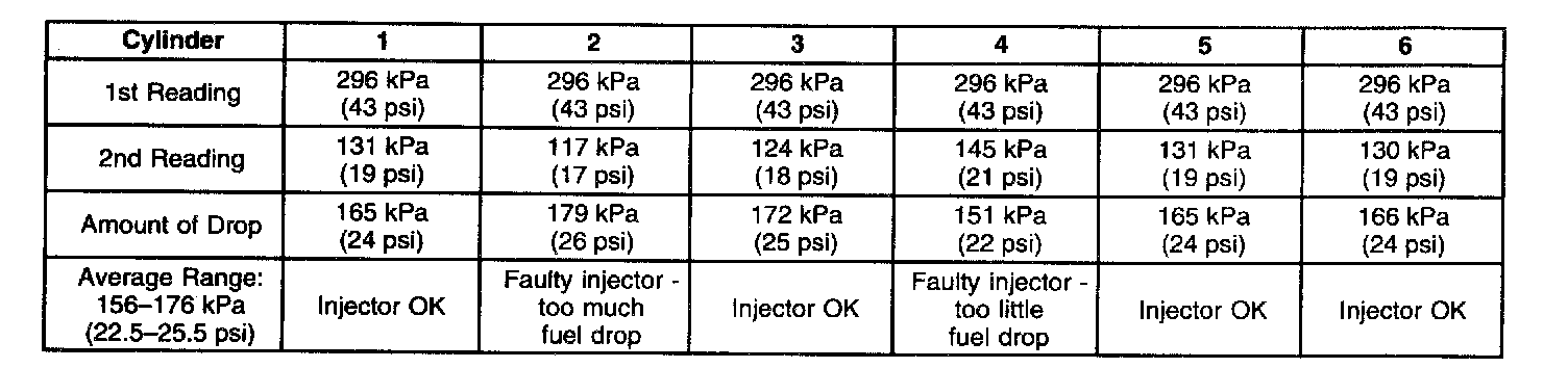 7. If the pressure drop value for each fuel injector is within 10 kPa (1.5 psi) of the average pressure drop value, the fuel injectors are flowing properly. Calculate the pressure drop value for each fuel injector by subtracting the second pressure reading from the first pressure reading.
