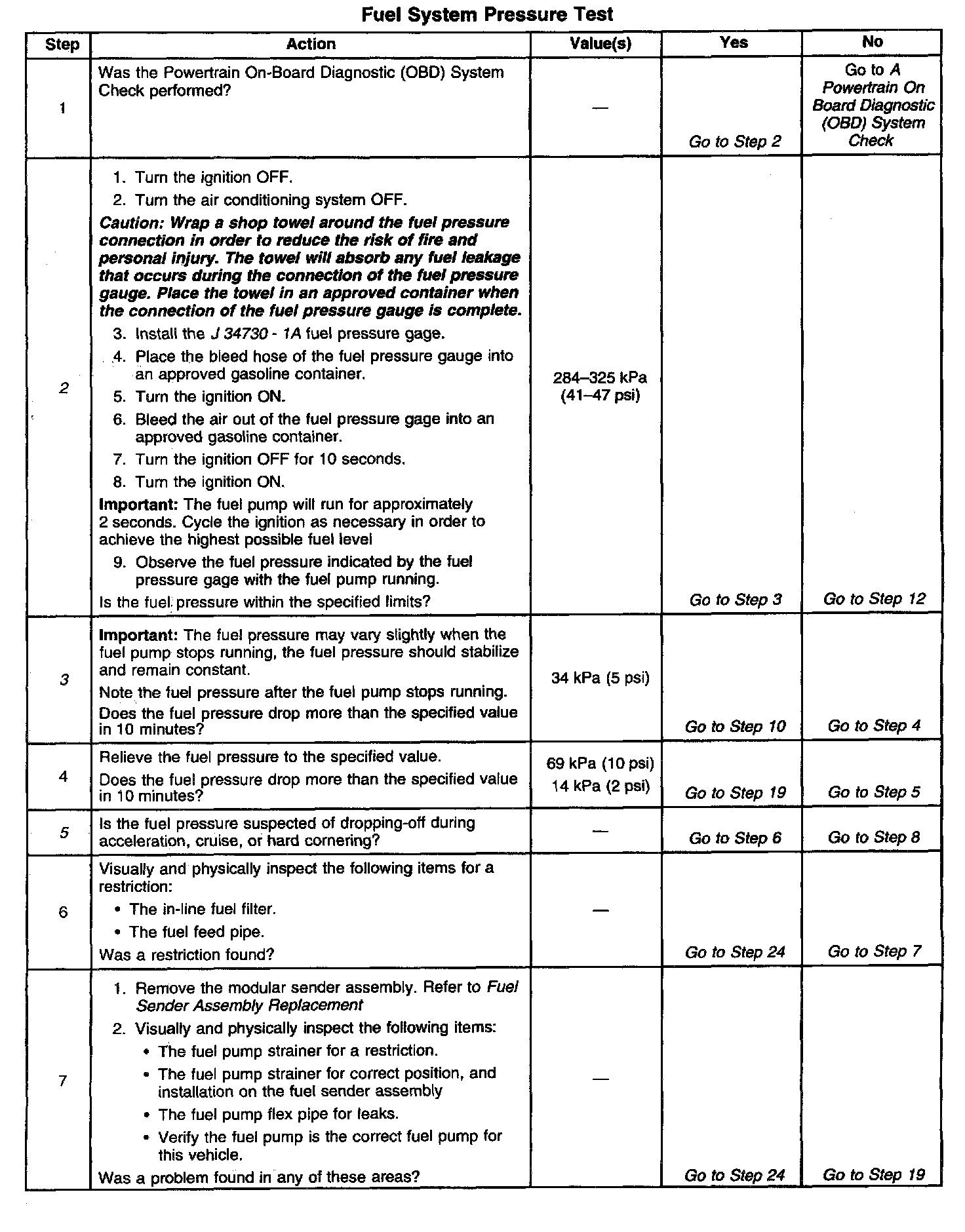 15. A lean condition may result from the fuel pressure being below 284 kPa (41 psi). A lean condition may cause a DTC P0131 or a DTC P0171 to set. Driveability conditions associated with lean conditions can include hard starting (when the engine is cold), hesitation, poor driveability, lack of power, surging, and misfiring.
