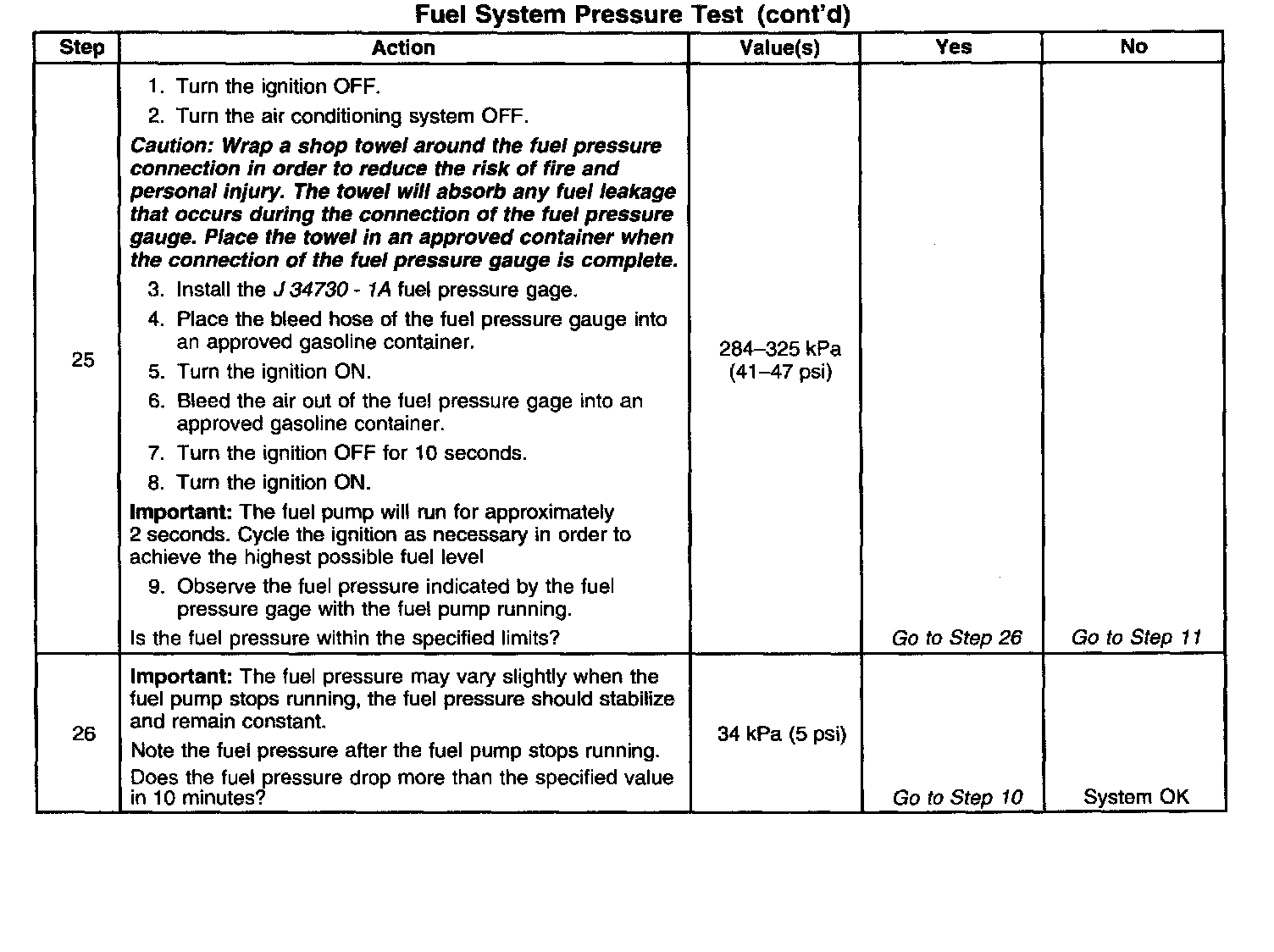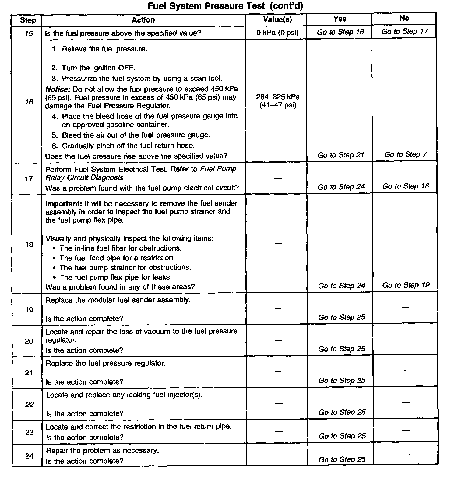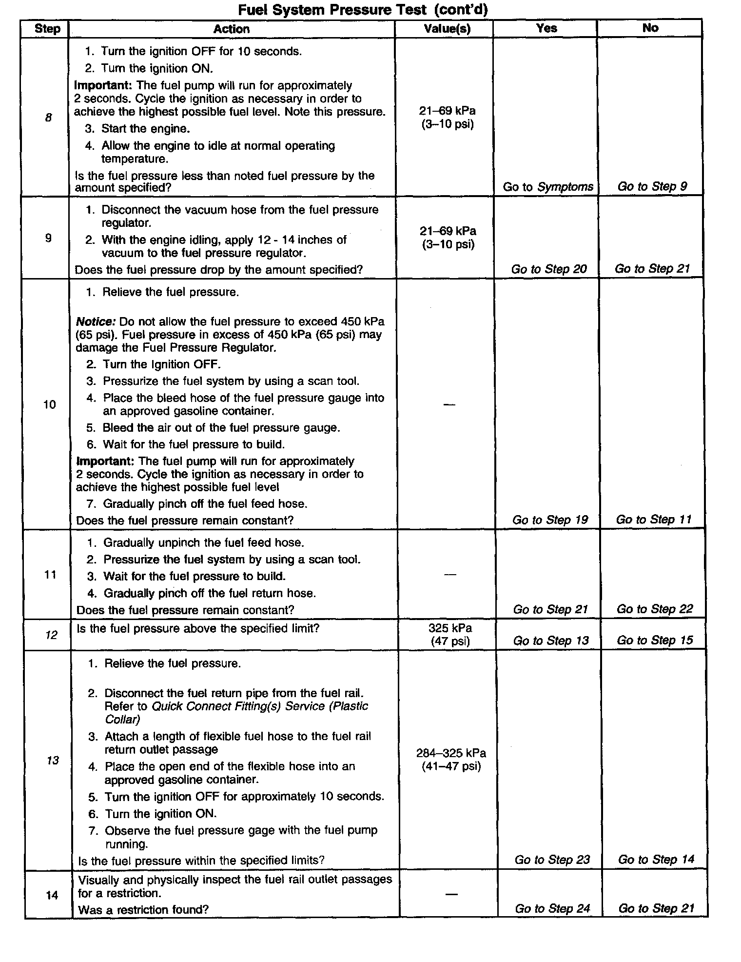 13. This test determines if the high fuel pressure is due to a restricted fuel return pipe or if the high fuel pressure is due to a faulty fuel pressure regulator.