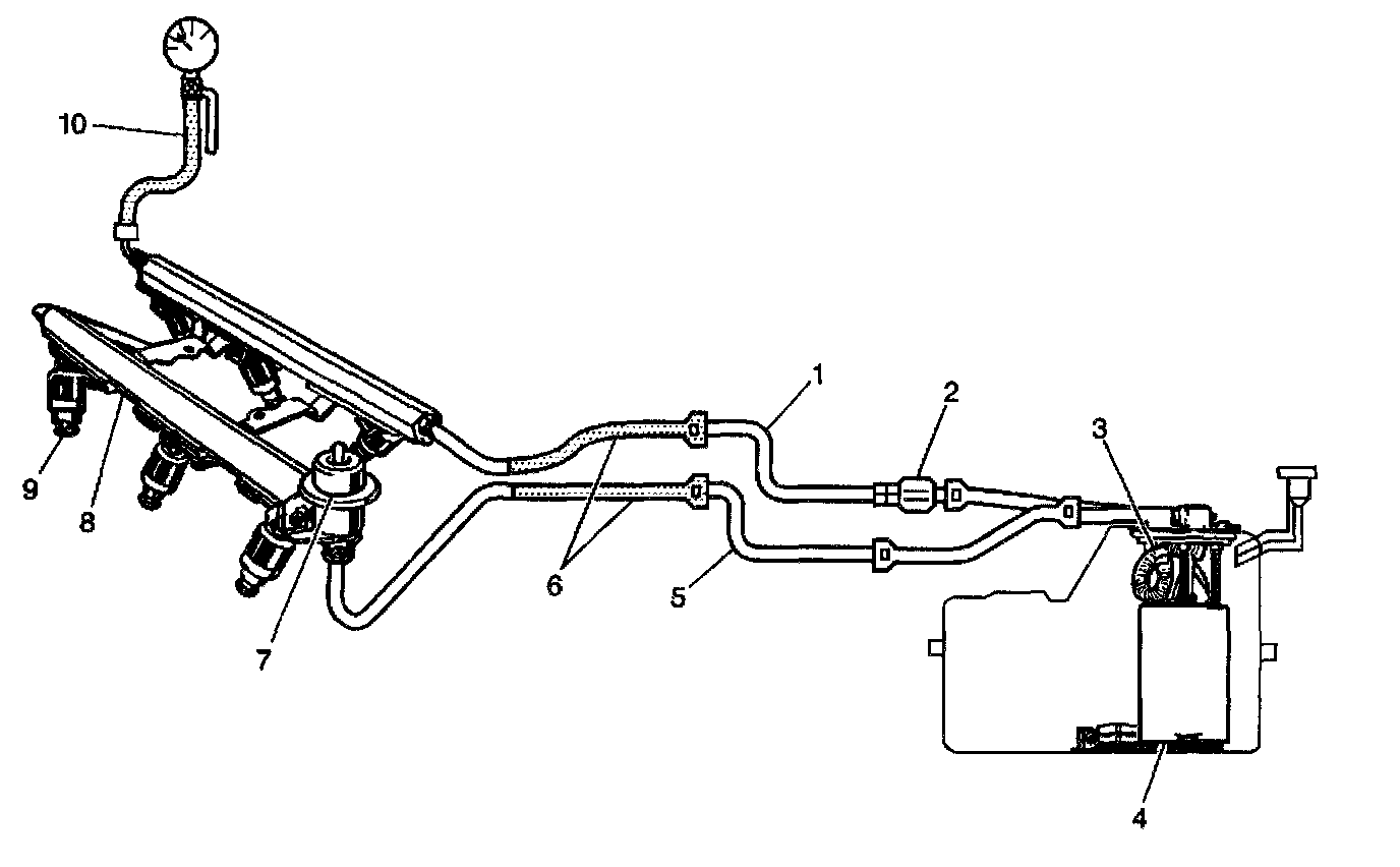 When the ignition switch is turned ON, the Powertrain Control Module (PCM) will turn ON the in-tank fuel pump. The in-tank fuel pump will remain ON as long as the engine is cranking or running and the PCM is receiving reference pulses. If there are no reference pulses, the PCM will turn the in-tank fuel pump OFF 2 seconds after the ignition switch is turned ON or 2 seconds after the engine stops running. The in-tank fuel pump is an electric pump within an integral reservoir (4). The in-tank fuel pump supplies fuel through the fuel feed pipe (1), and in-line fuel filter (2) to the Fuel Rail Assembly (8). The fuel pump is designed to provide fuel at a pressure above the pressure needed by the fuel injectors (9). A fuel pressure regulator (7), attached to the Fuel Rail, keeps the fuel available to the fuel injectors at a regulated pressure. Unused fuel is returned to the fuel tank by a separate fuel return pipe (5). The fuel pump flex pipe (3) functions as a conduit for transporting pressurized fuel from the fuel pump to the above cover fuel feed pipe. The fuel pump flex pipe also eliminates fuel pump generated pressure pulse noise, and eliminates clamps formerly needed for rubber hoses or nylon pipes. The fuel pressure gauge J 34730 - 1A (10). The fuel pipe return and feed hose assemblies are the pinch points used during the fuel system pressure test (6).