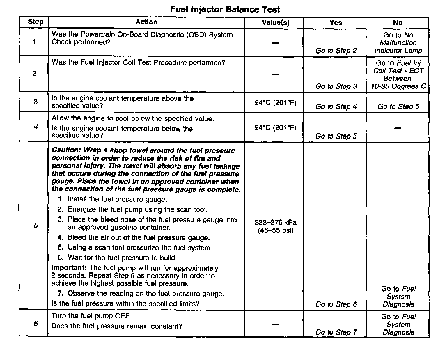 5. The fuel pressure should be within the specified range. If the fuel pressure is not within the specified range, go to Fuel System Diagnosis. Component Tests and General Diagnostics