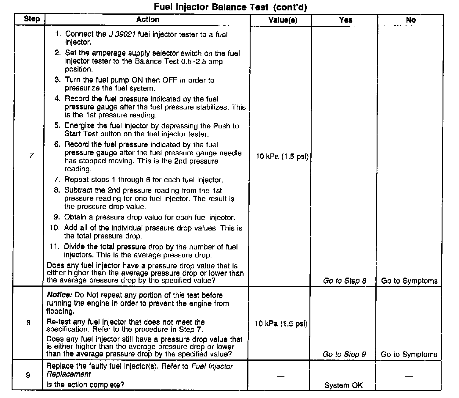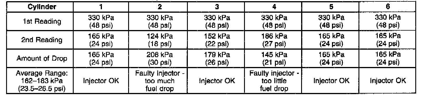 7. If the pressure drop value for each fuel injector is within 10 kPa (1.5 psi) of the average pressure drop value, the fuel injectors are flowing properly. Calculate the pressure drop value for each fuel injector by subtracting the second pressure reading from the first pressure reading. Refer to the Injector Balance Test Example.