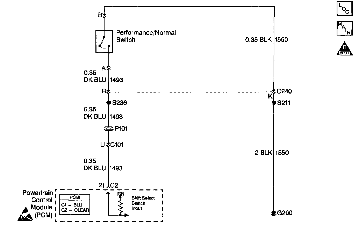 The shift select system allows the driver to select one of two shift patterns, NORMAL or PERFORMANCE. The PERFORMANCE / NORMAL switch is a normally open switch, that when closed, provides a ground path to the powertrain control module (PCM). When the PCM receives the ground signal, it switches into the PERFORMANCE mode and the following changes occur: