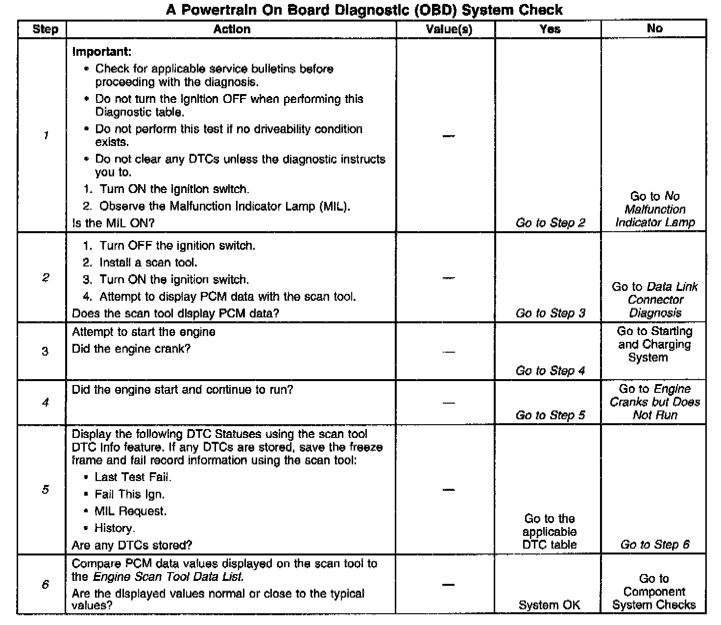 1. The MIL should be ON steady with the key ON / engine OFF. If not, the No Malfunction Indicator Lamp table should be used to isolate the malfunction.