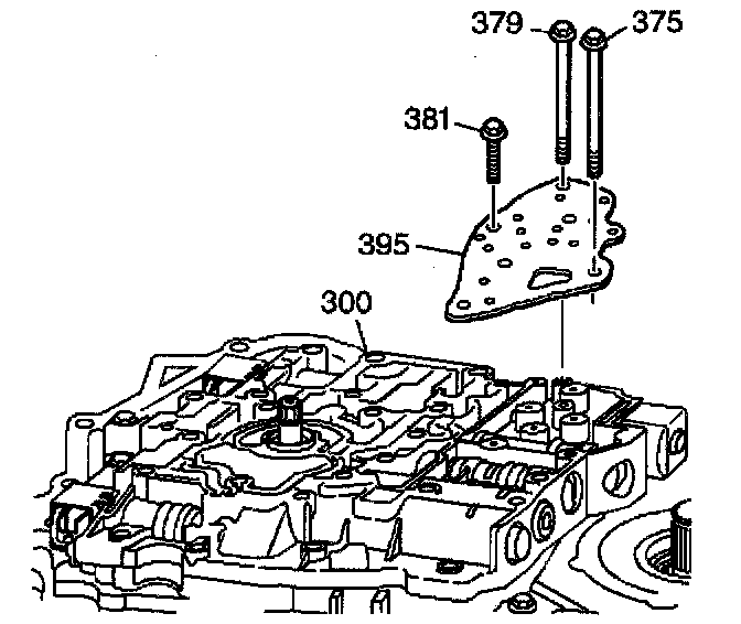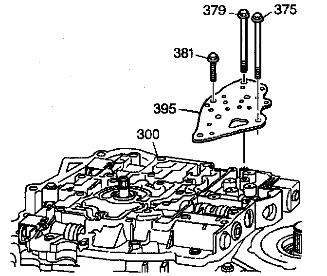 3. Remove the control valve body bolts (375, 379 and 381) that mount the fluid pressure manual valve position switch to the control valve body (300).