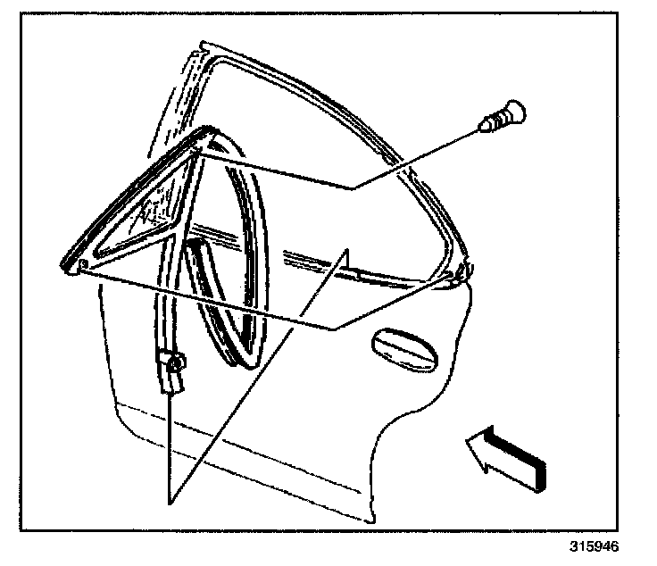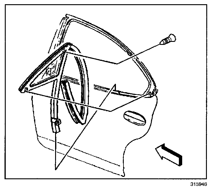 REMOVAL PROCEDUREThe rear door stationary window is part of the door window weatherstrip. If the stationary window needs service, replace the entire door window weatherstrip.