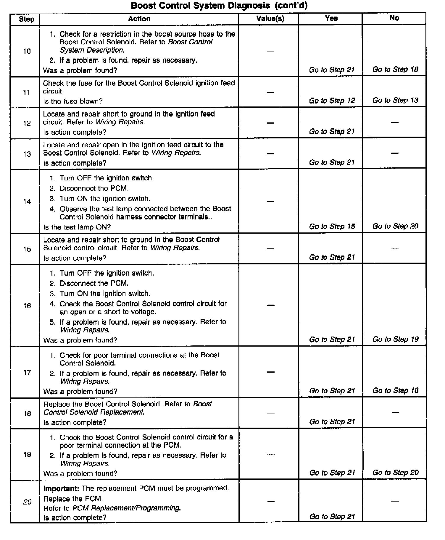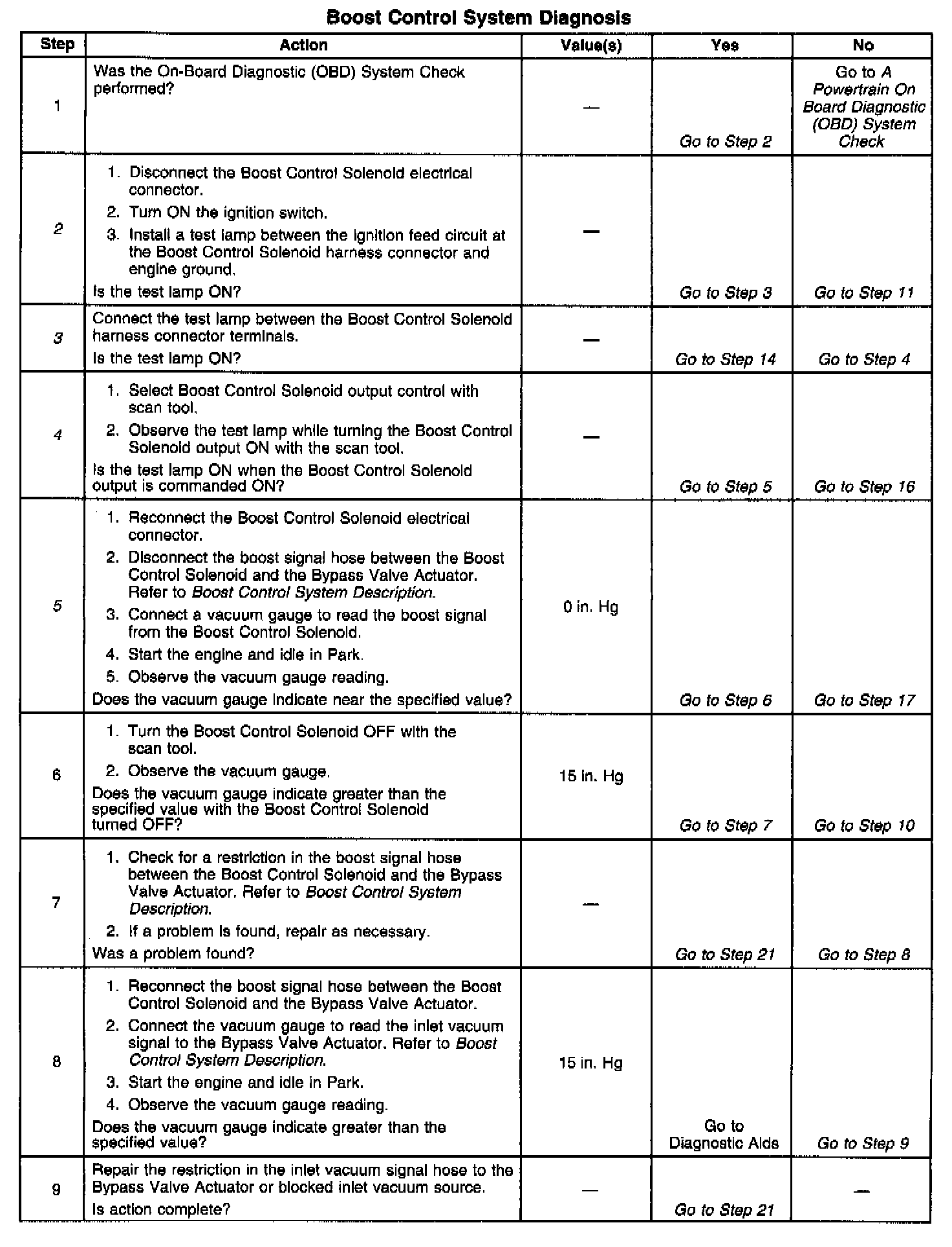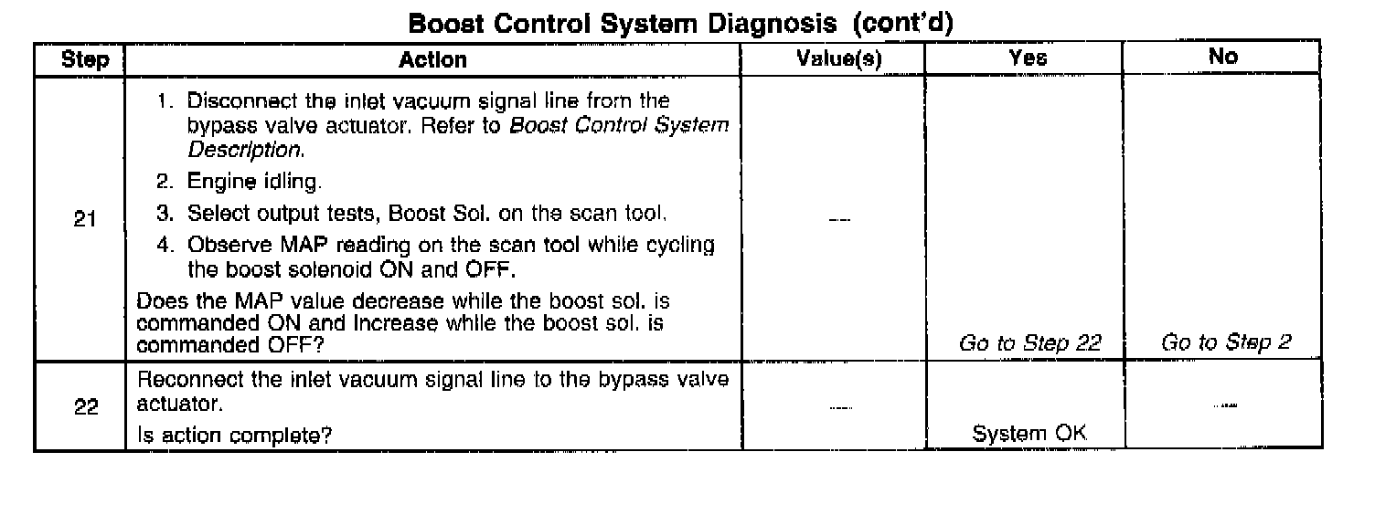 If the Boost Control System Check has been performed and no electrical or vacuum related fault is noted, check for the following conditions: