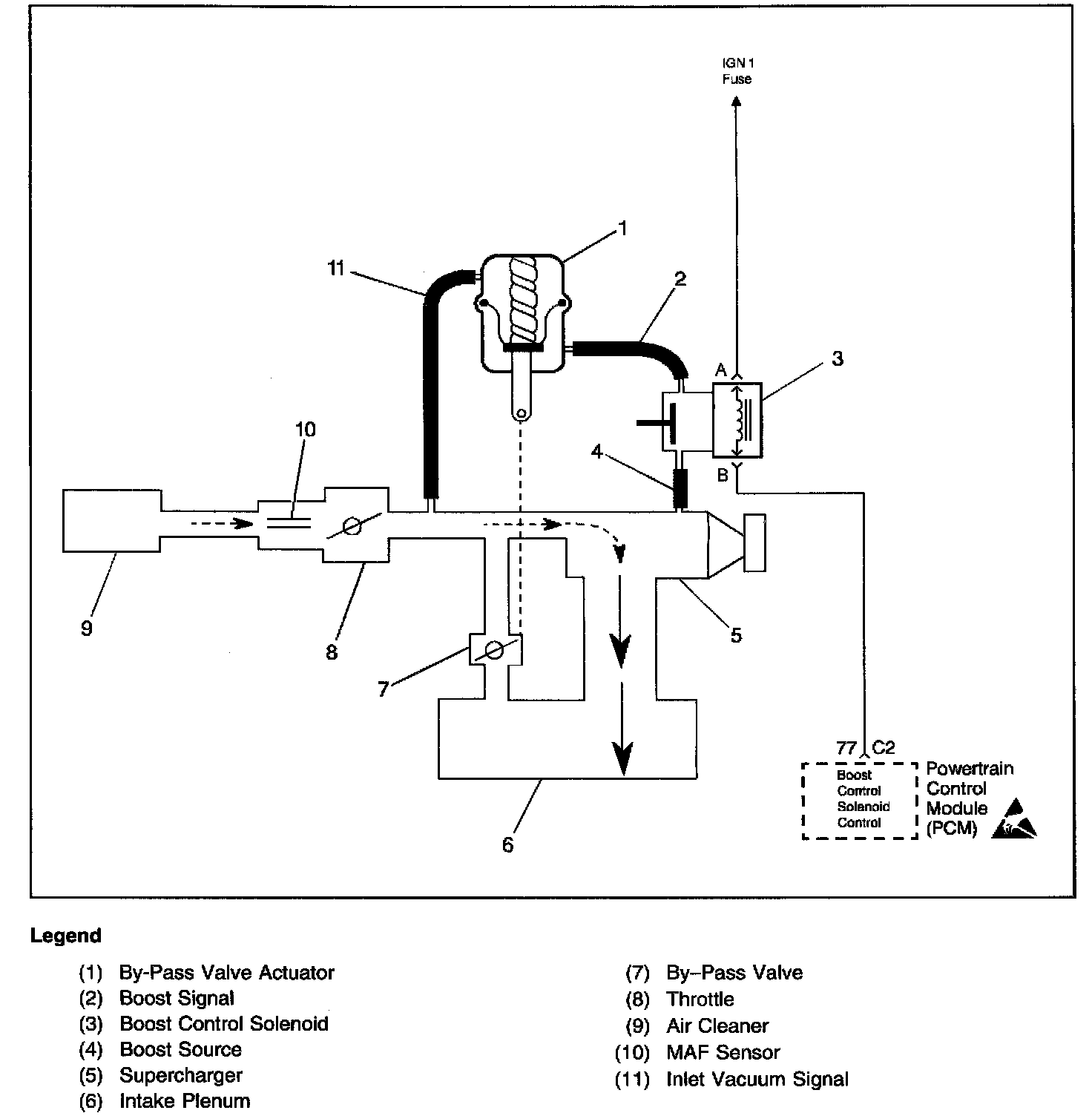 Under most conditions, the PCM commands the boost control solenoid to operate at a 100% duty cycle (ON) to allow full boost pressure upon demand. However, if reverse gear is selected or the PCM detects rapid deceleration or engine load is extremely high, reduced boost pressure is desired Under these conditions, the PCM commands the boost control solenoid to operate at a 0% duty cycle (OFF), which opens the bypass valve. With the Bypass valve open, boost pressure is reduced by recirculating intake air back through the supercharger inlet.