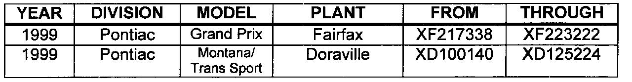 Involved are certain 1999 Pontiac Grand Prix and Montana/Trans Sport model vehicles built within the VIN breakpoints shown.