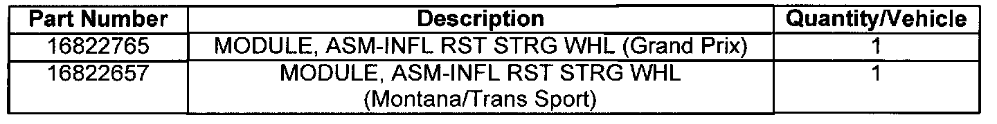 General Motors has decided that a defect which relates to motor vehicle safety exists in certain 1999 Pontiac Grand Prix and Montana/Trans Sport model vehicles. The driver's air bag inflator in these vehicles could produce excessive internal pressure. In the event of a crash that would trigger a driver's air bag deployment, the increased pressure can cause the inflator to explode. If an air bag inflator explodes, metal and plastic debris could cause severe injury to vehicle occupants.