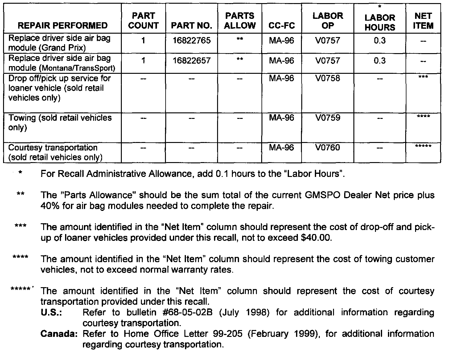 ^ For U.S. - Replacement parts are on order control and a Customer Assistance case number will be required to release a part for each involved vehicle. If you have not already been contacted by the Customer Assistance Center, you must call them at 866-944-9090, to obtain a case number. Once you have a case number, call GMSPO at 1-800-433-6961 (8:30 AM to 5:00 PM ET) to order the replacement part. If parts are needed because of a collision or to complete other repairs, dealers must call GMSPO at 1-800-433-6961.