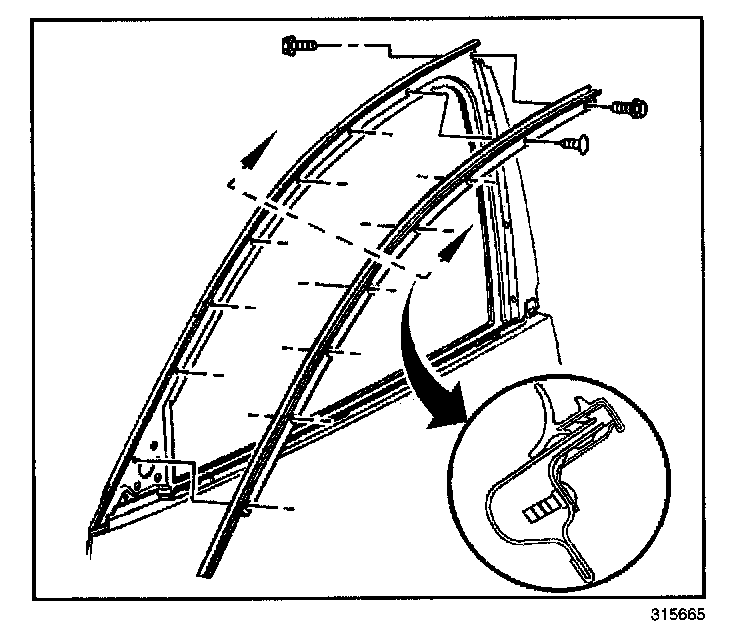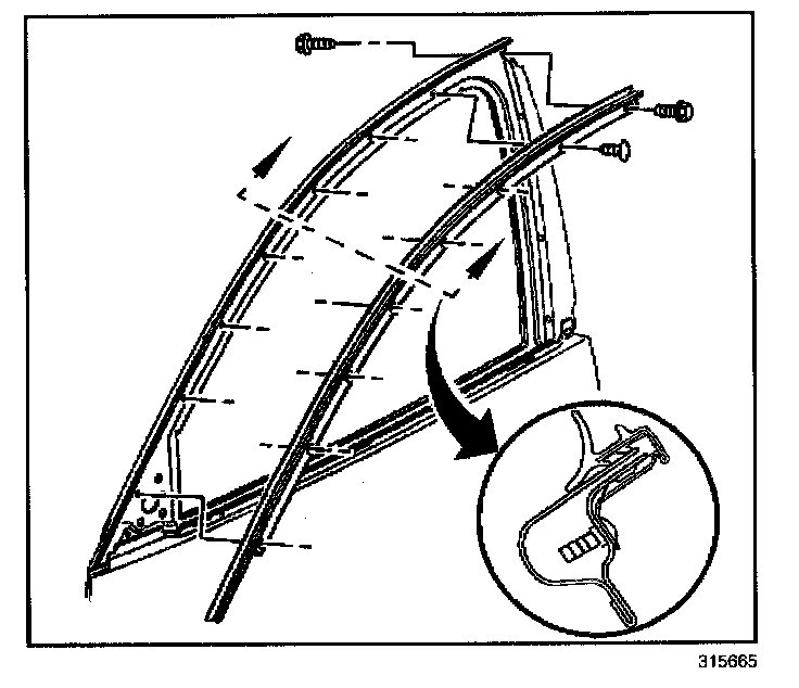 2. Pull down the door window weatherstrip in order to gain access to the screws.