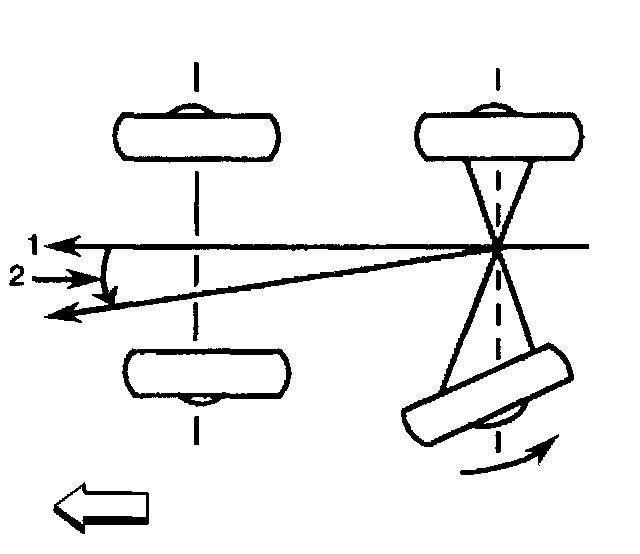 The front wheels aim or steer the vehicle. The rear wheels control the tracking. This tracking action is relative to thrust angle. Thrust angle (2) is defined as the path that the rear wheels take. Ideally, the thrust angle is geometrically aligned with the body centerline (1).